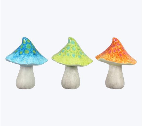 Brighten up your spring decor with this charming set of ceramic mushrooms. Each of the three pieces features a unique multicolored cap, transitioning from blue hues, green and yellow, and yellow to orange, adding a whimsical touch to any tabletop. Ideal for bringing a playful, nature-inspired accent to your home. From Youngs.