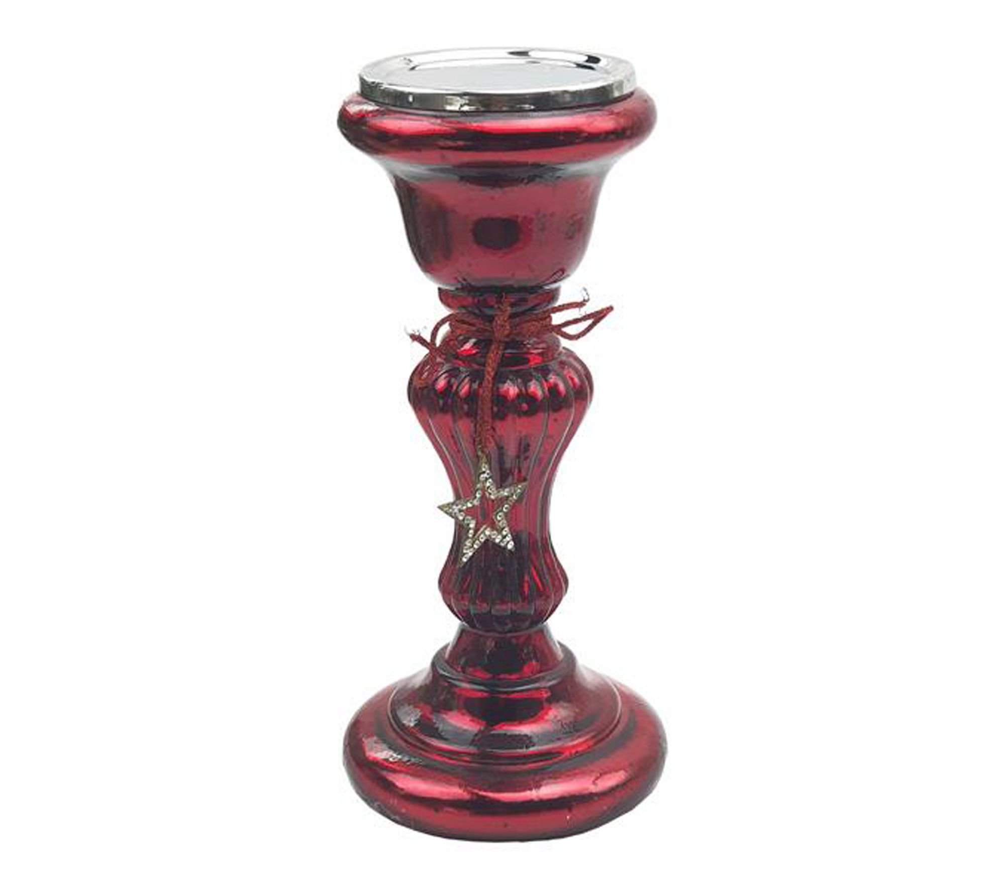 Set the scene for cozy gatherings or festive celebrations with this glass pillar candle holder, designed to showcase your favorite 4" base candle. The rich red glass features gentle shaping and texture, accented by a silvertone metal base and a charming silver star hanging from a red cord -- bringing warmth and seasonal cheer to mantels, tables, or entryways. From Young's.