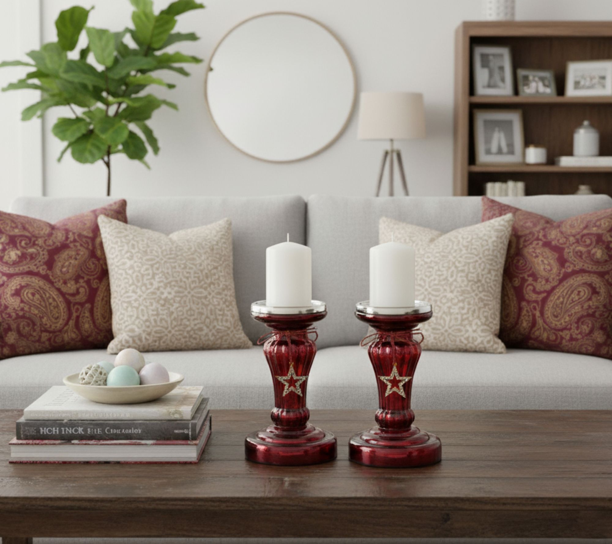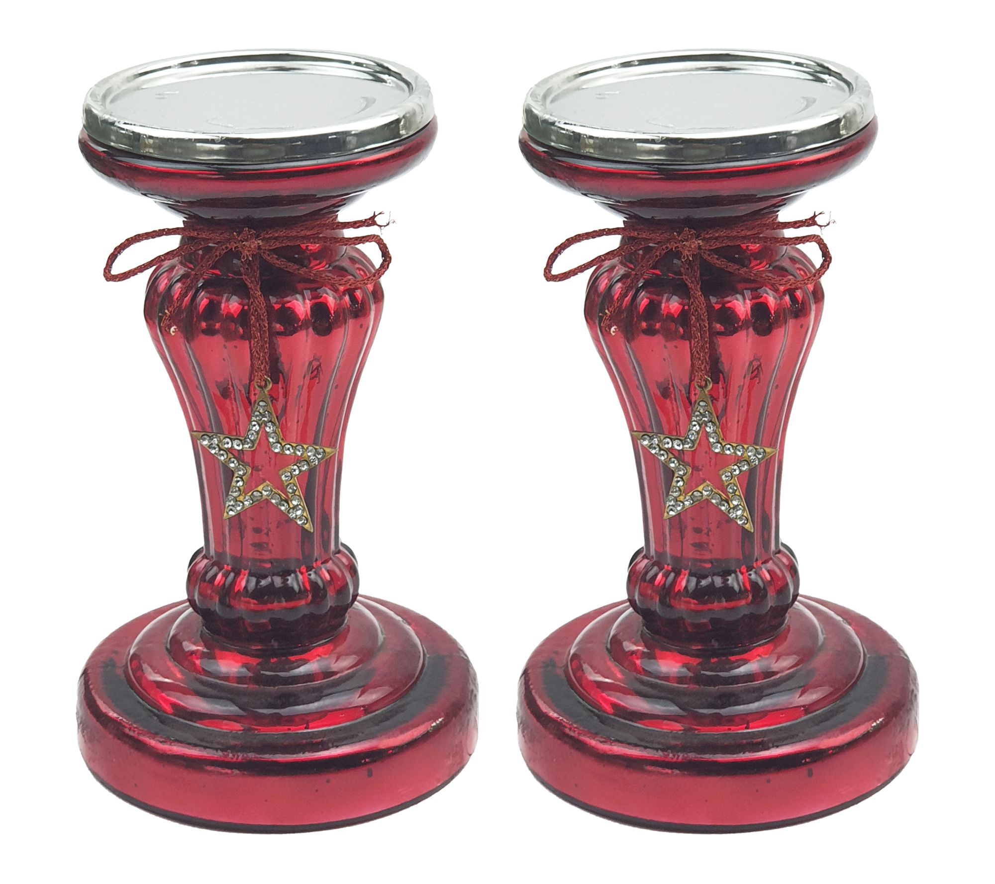 Warm up your space with the glow of candlelight using these elegant glass pillar candle holders. Featuring gently textured red glass, a striking metal base, and a silvertone star accent, they create a festive centerpiece for holiday gatherings or everyday ambiance. From Young's.