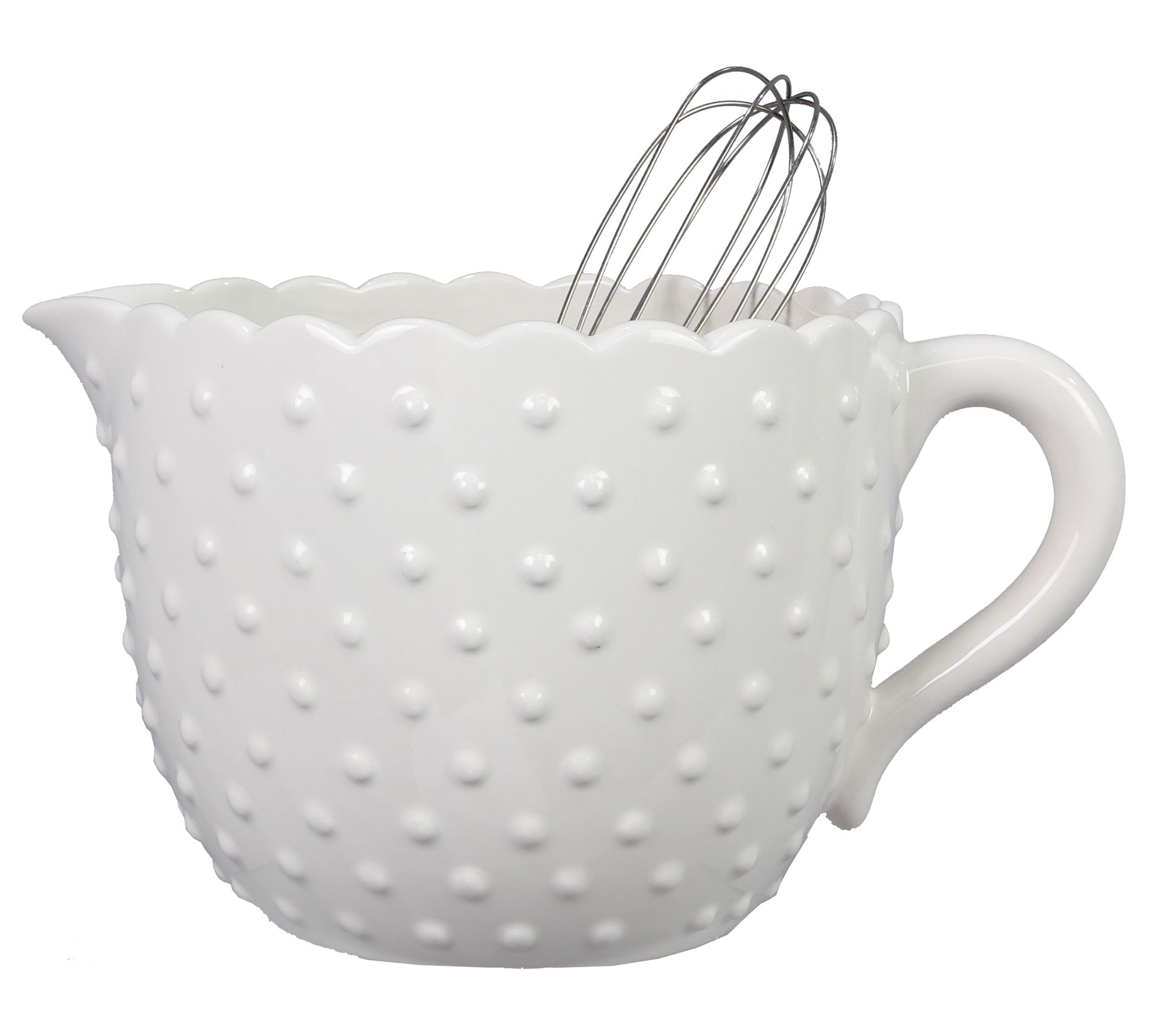 This ceramic mixing bowl and whisk set is the perfect combination of functionality and fashion. The mixing bowl design features raised ceramic dots for texture and style. From Young's, Inc.