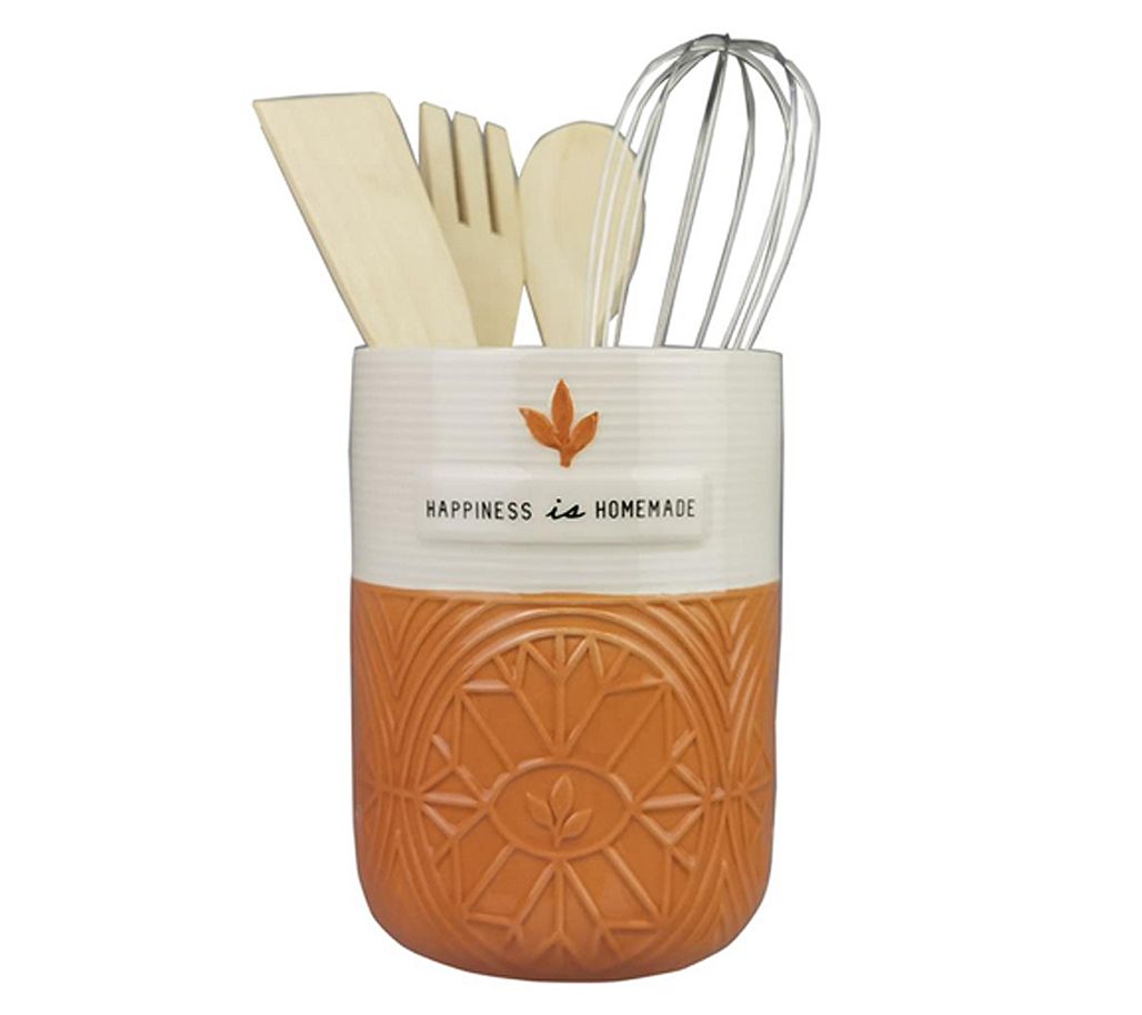 Add a touch of joy and homey style to your kitchen with this ceramic cooking tool holder with utensils, featuring a terracotta base with an embossed design, white embossed striped top, and "happiness is homemade" written in black lettering. From Young's Inc.