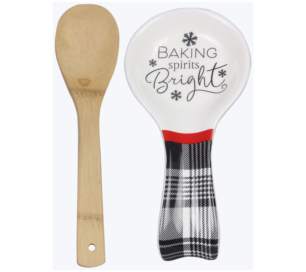 A beautiful addition to your kitchen, this Modern Farmhouse Christmas Spoon Rest with Spoon is a decorated addition to the most productive holiday countertops. The spoon rest has a holiday red stripe that separates the top from the black and white buffalo plaid on the handle. In the center of the bowl of the spoon rest it says, in black printing, "Bakiing Spirits Bright". It also has black snowflakes around the words. The spoon comes nestled in the spoon rest, held by a red ribbon. A brown tag attached tot he ribbon says "Baking Spirits Bright". The spoon rest measures 9.25"x4.6"x1" and is made of ceramic. It is microwave and dishwasher safe. The spoon is made of bamboo wood, measures 10"x2"x1", and should be hand washed. Both are made in China.;1 Spoon Rest with Spoon
