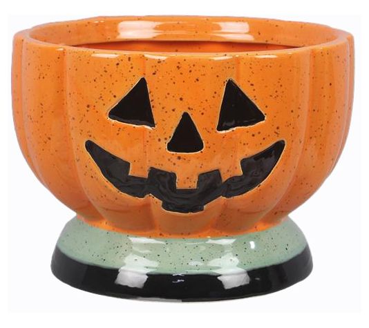 Add a touch of Halloween charm to your table with this ceramic candy bowl. Perfect for serving up your favorite fall treats, this bowl features a smiling orange and black speckled pumpkin face and a ribbed design. The wide top makes it easy to fill with goodies, while the sturdy base adds stability. From Young's.