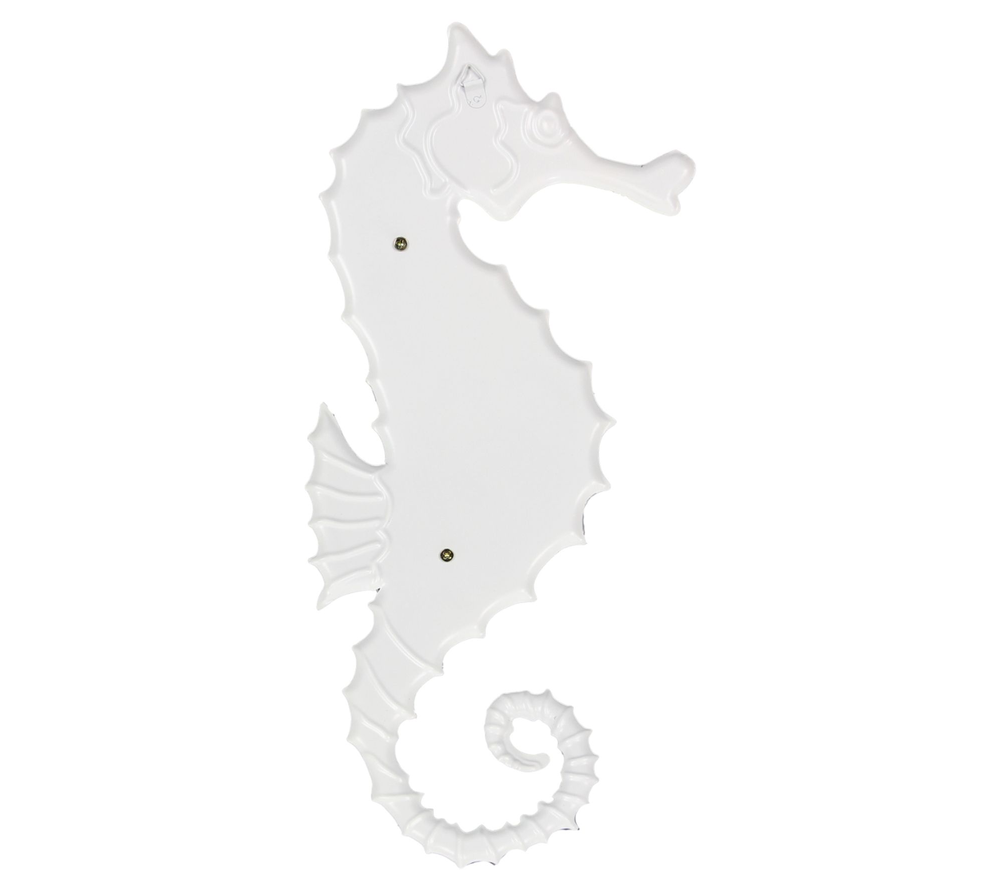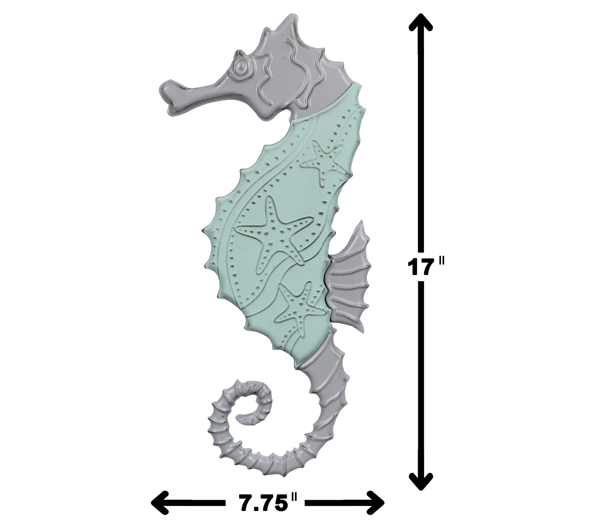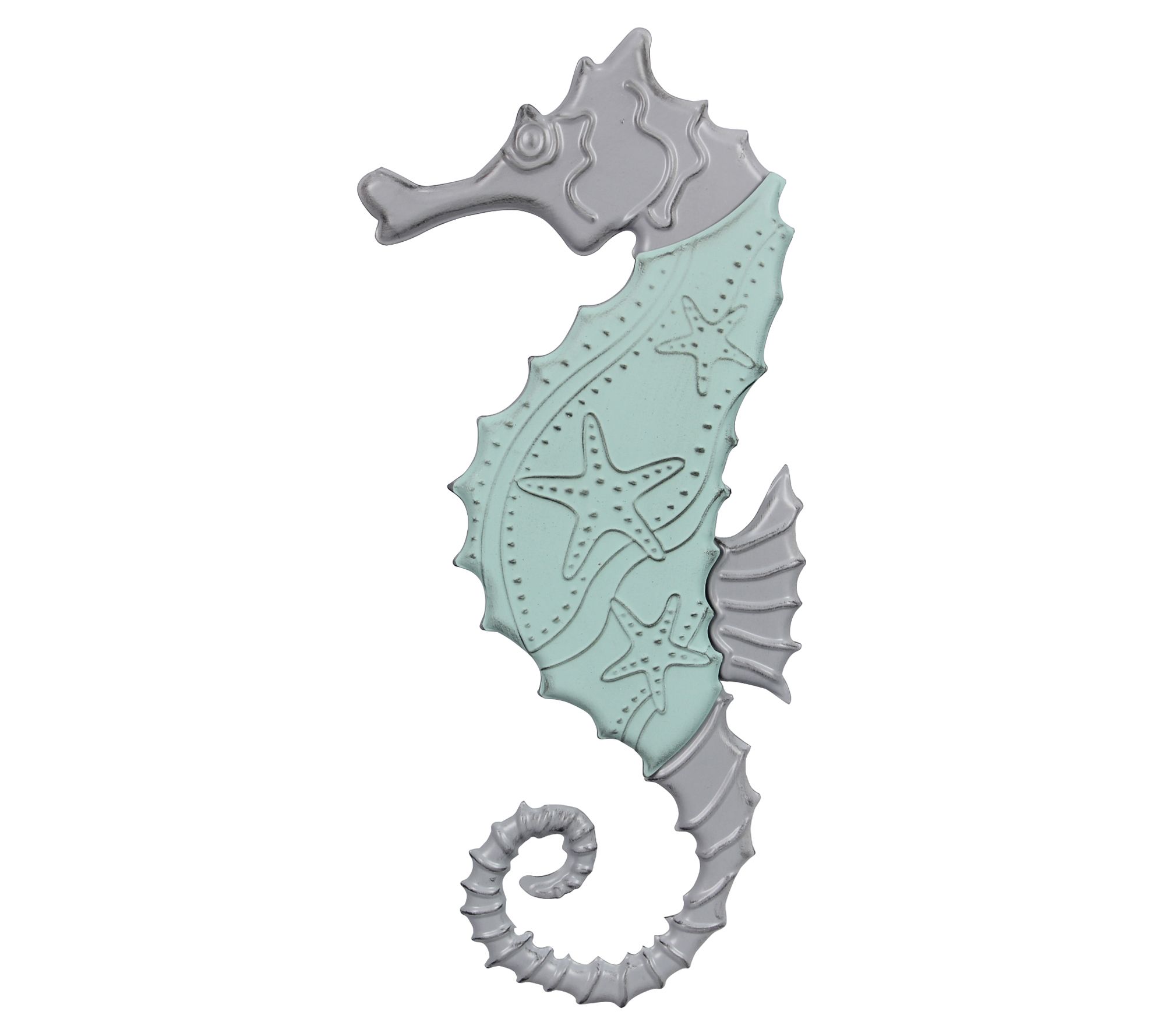 Elevate your coastal decor with the Youngs Metal Seahorse Wall Sign, a stunning piece that captures the essence of the ocean. This two-toned metal art features a gracefully designed seahorse adorned with starfish and wave details, perfect for adding a touch of elegance to any space. From Youngs.