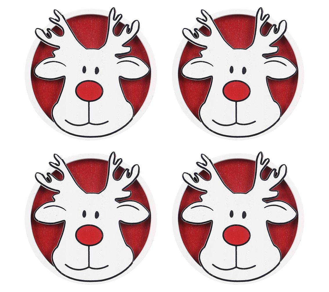 Keep spills off the table and add a splash of holiday cheer to your home with this set of four wooden coasters, each featuring a fun red-nosed reindeer design. From Young's.