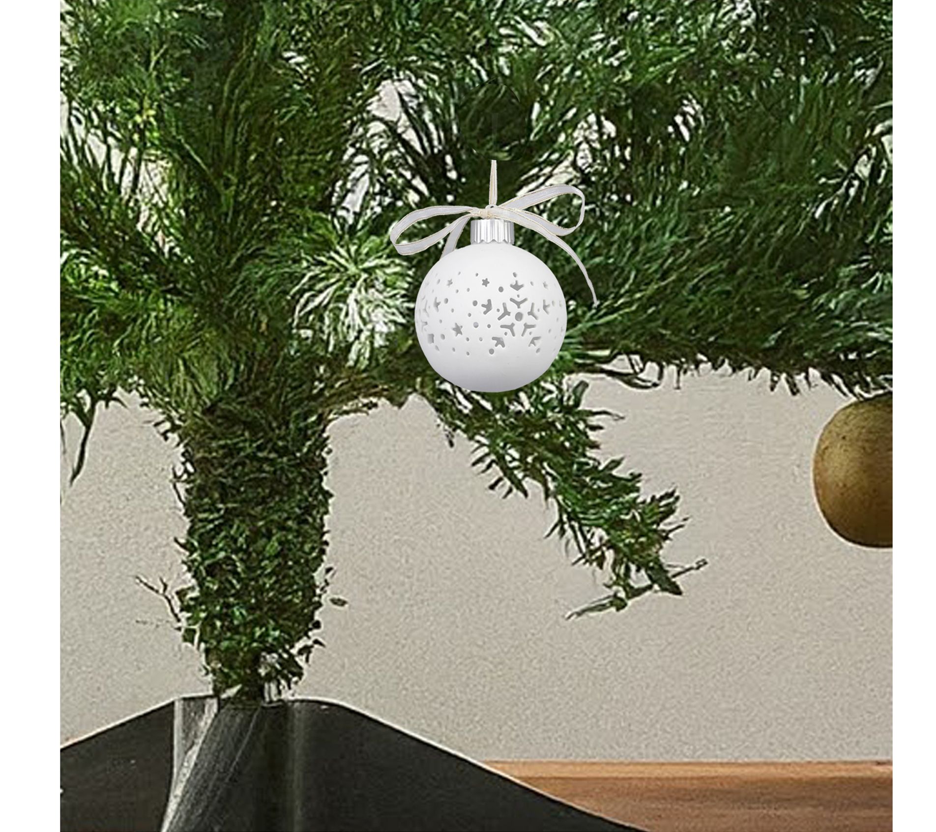 Transform your space into a winter wonderland with this set of three ceramic ball ornaments, each adorned with a unique laser-cut snowflake design. When illuminated from within by LED lights, these ornaments cast a warm, enchanting glow, perfect for creating a cozy holiday ambiance. Hang them up using the included satiny ribbon and watch as they transform your space into a magical scene. From Young's.