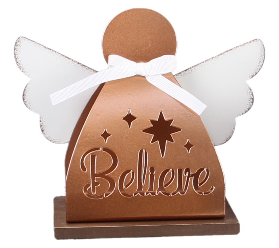 This lovely set of tabletop angels each display a heartwarming sentiment of Joy, Believe, and Peace. Display them on a tabletop, mantel, or shelf for all to see. From Young's Inc.