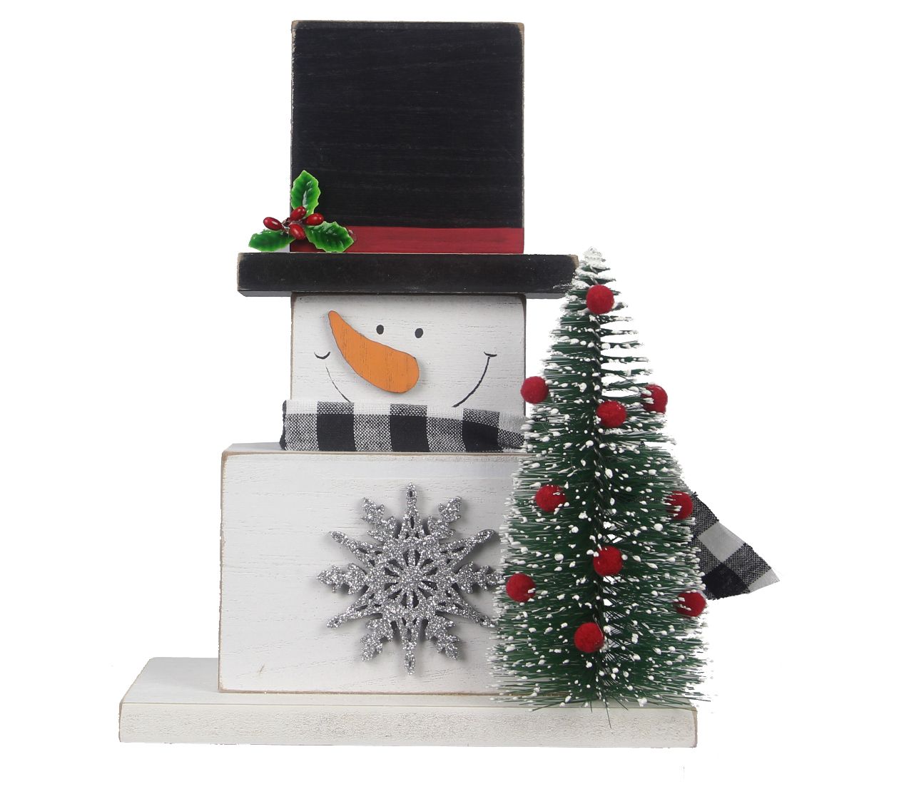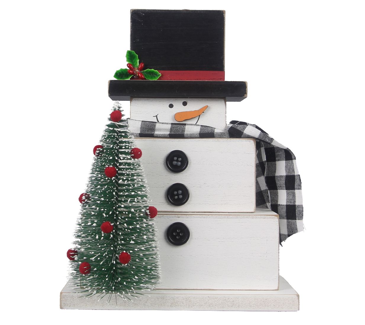 Add a hefty dose of cheer to your decor courtesy of this set of charming snowman tabletop accents, each adorned with a miniature bottlebrush pine tree for added festivity. From Young's.