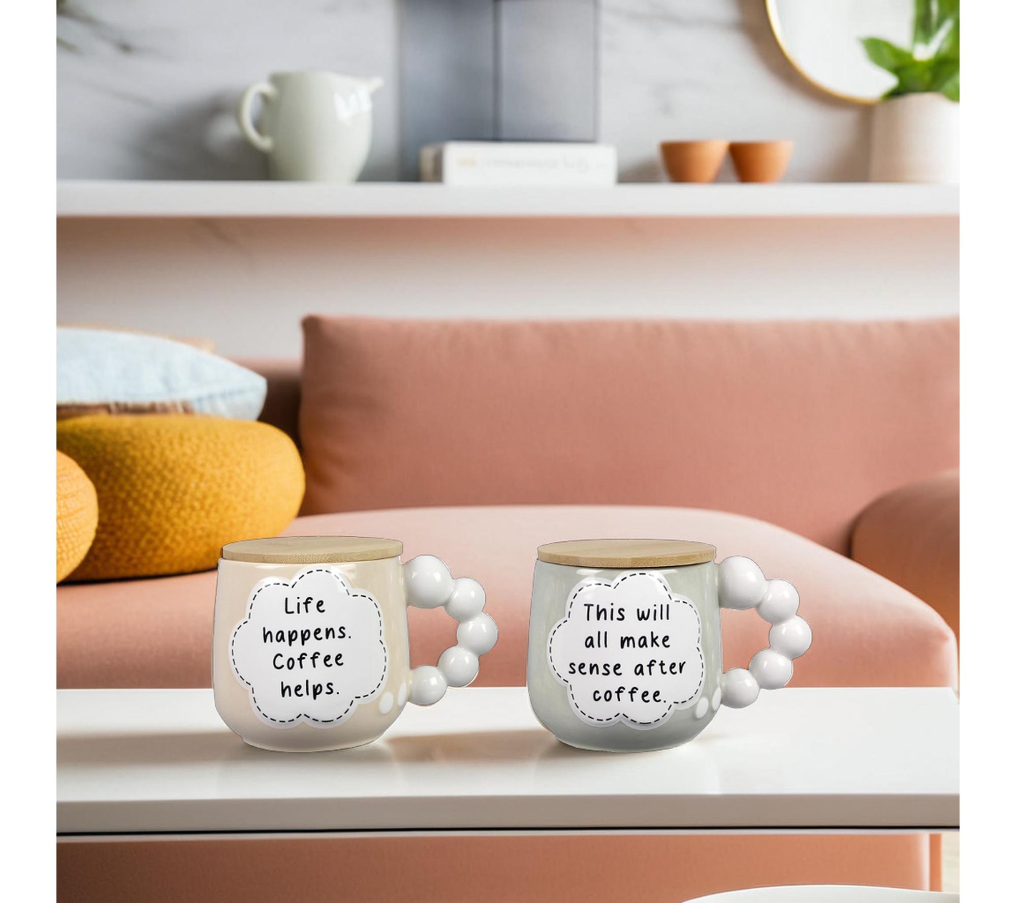 Start your mornings with a smile using this set of ceramic thought bubble mugs. Featuring cheerful phrases like "Life happens; coffee helps" or "This will all make sense after coffee," these mugs come with bamboo lids that double as coasters. Treat yourself to a fun and functional drinking experience. From Young's.