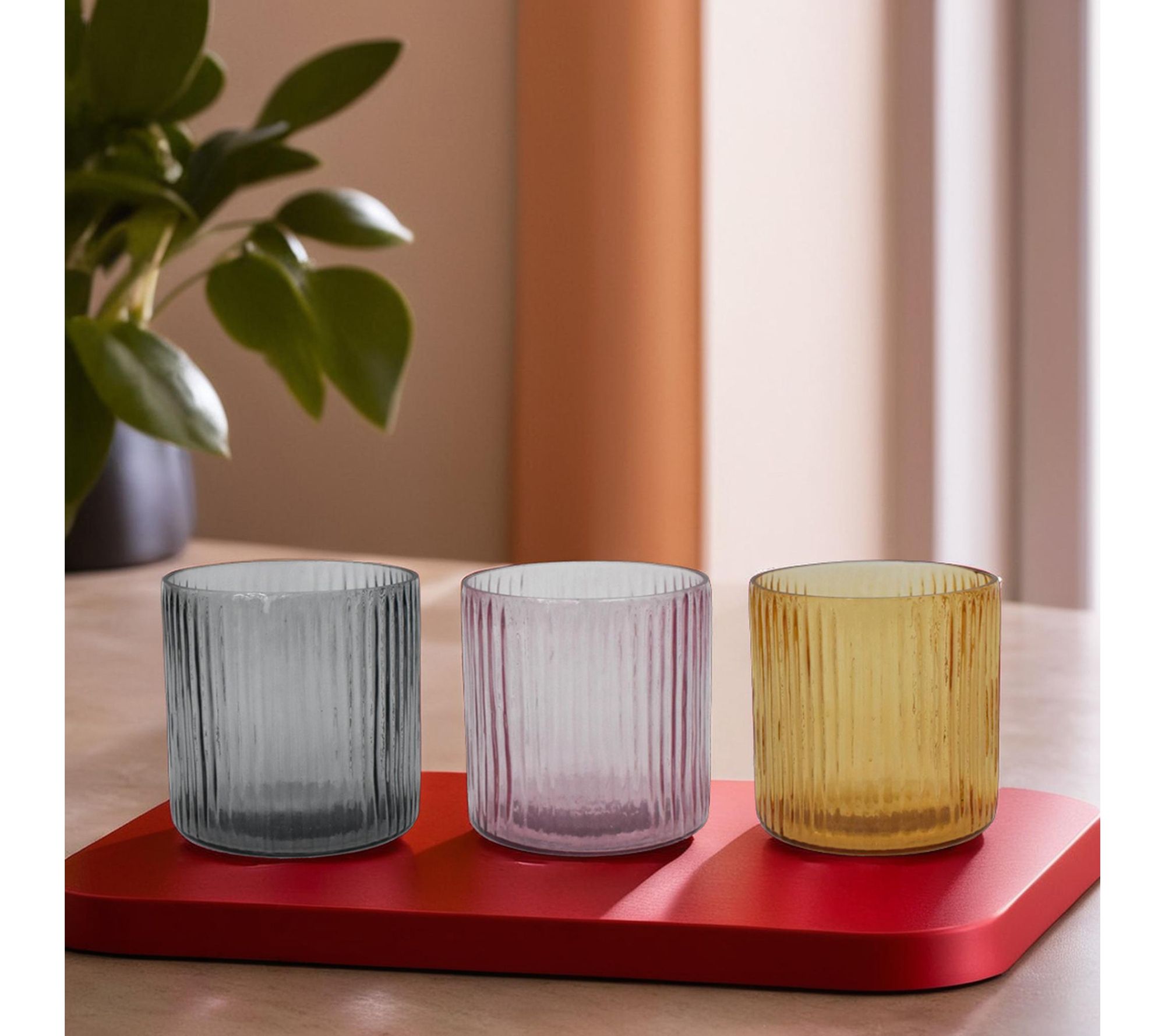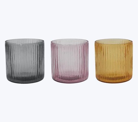 Add a touch of elegance to your space with this set of three vintage-inspired glass candle holders. Featuring a ribbed texture and timeless hues of amber, smoke gray, and rose, these holders add warmth and sophistication to any decor. Perfect for tea lights or small candles, they make a stunning centerpiece or accent piece.