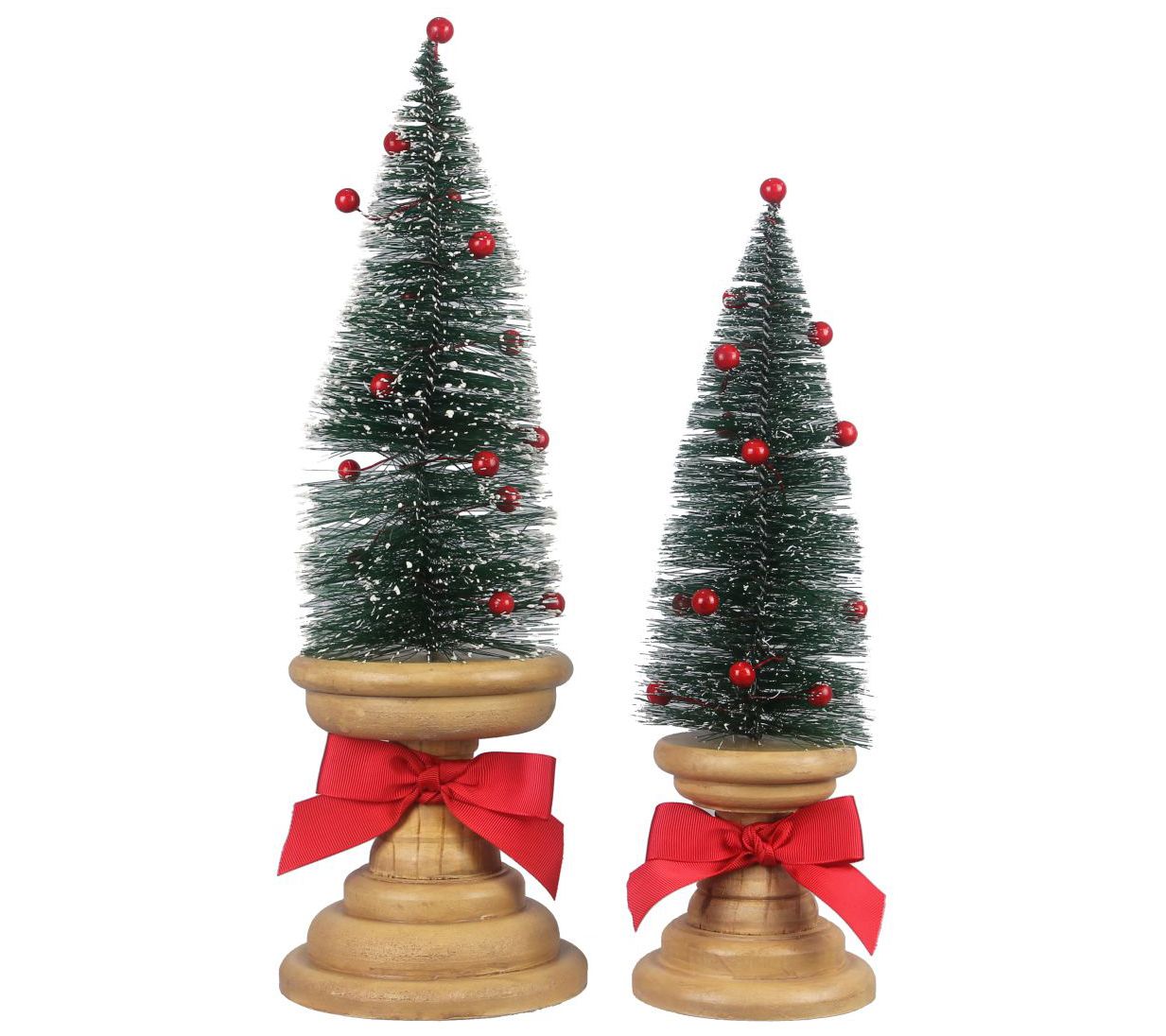 Transform your table into a winter wonderland with this set of two bottlebrush trees, each sits atop a natural wood pedestal and features bright red berries and a festive red bow. From Young's Inc.