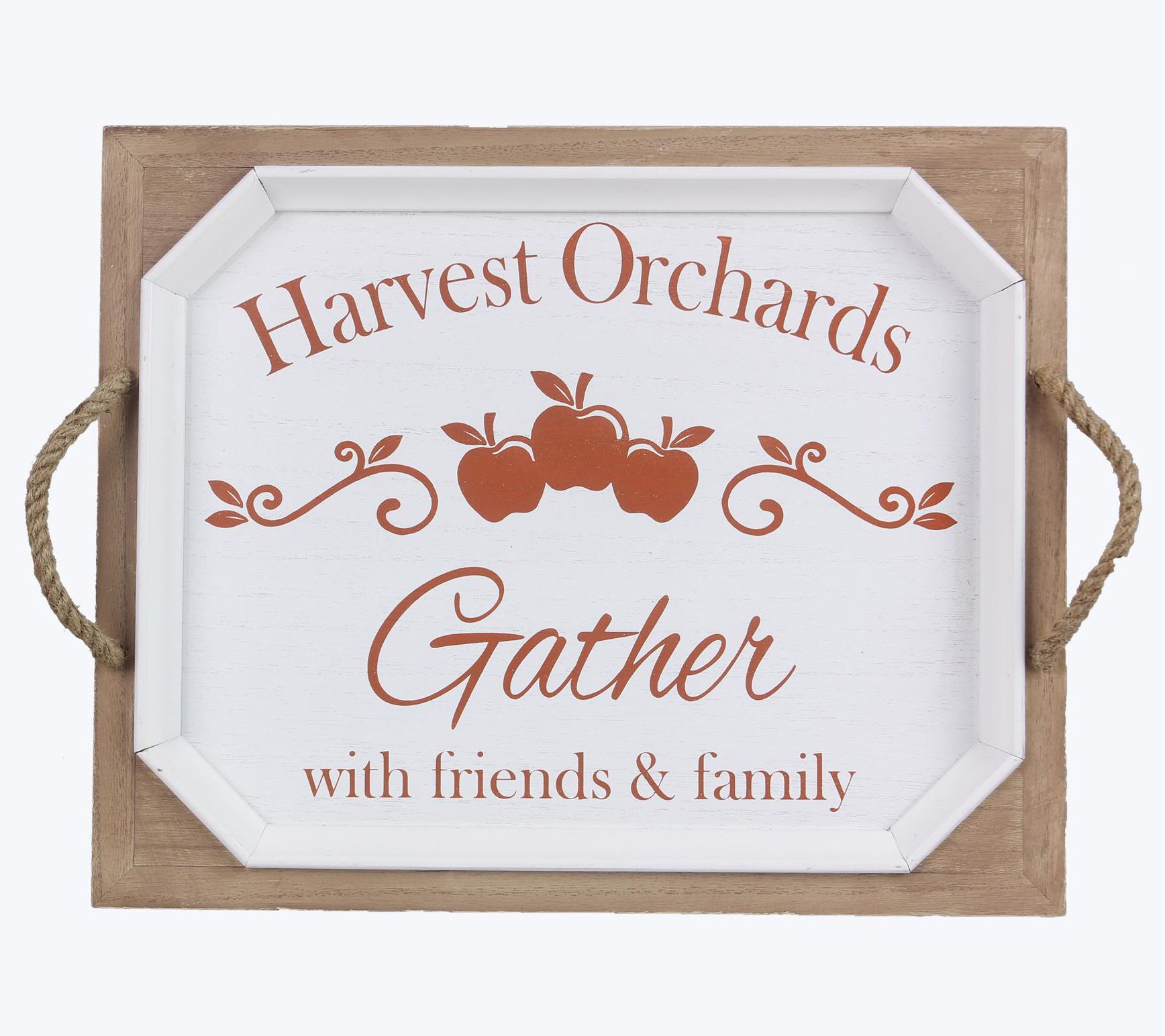Celebrate the cozy gatherings and joys of the harvest season with this wooden tray accented by jute handles, fun messaging, and apple graphics. From Young's.