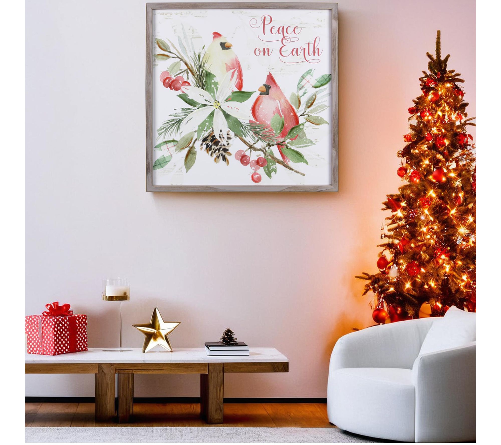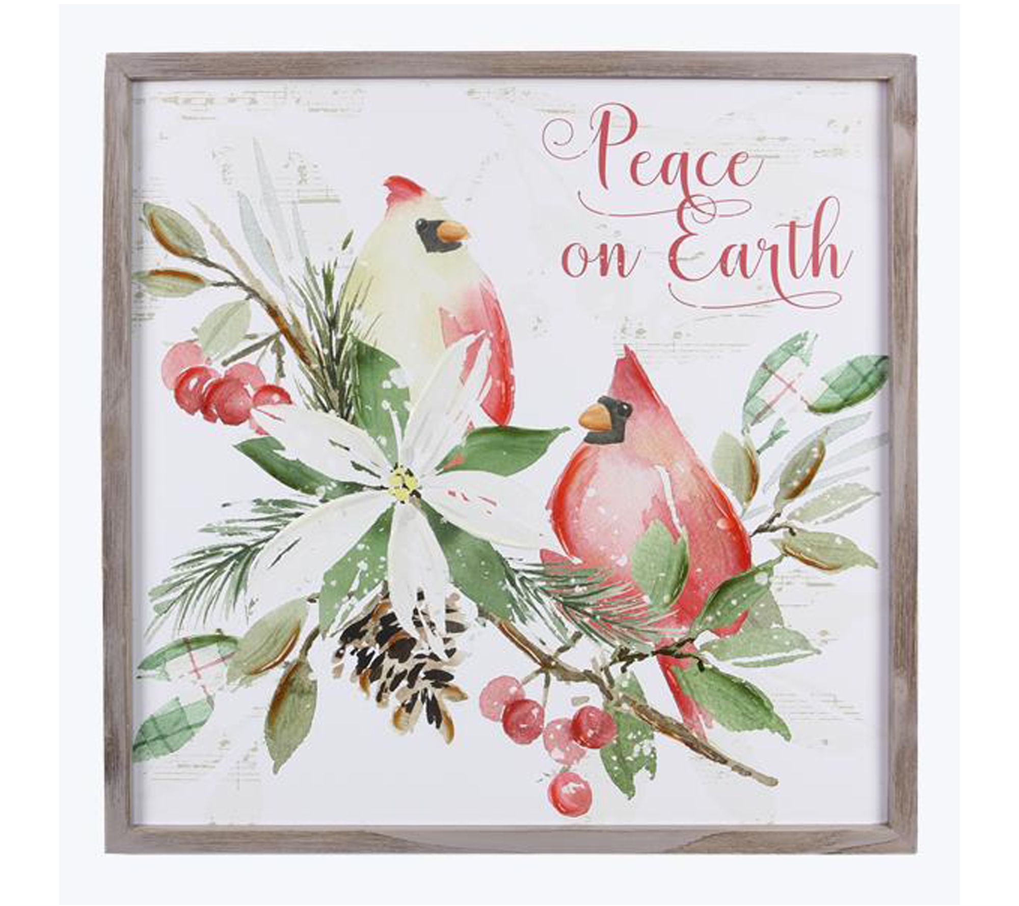 • Features two cardinals on a tree bough print with "Peace on Earth" message