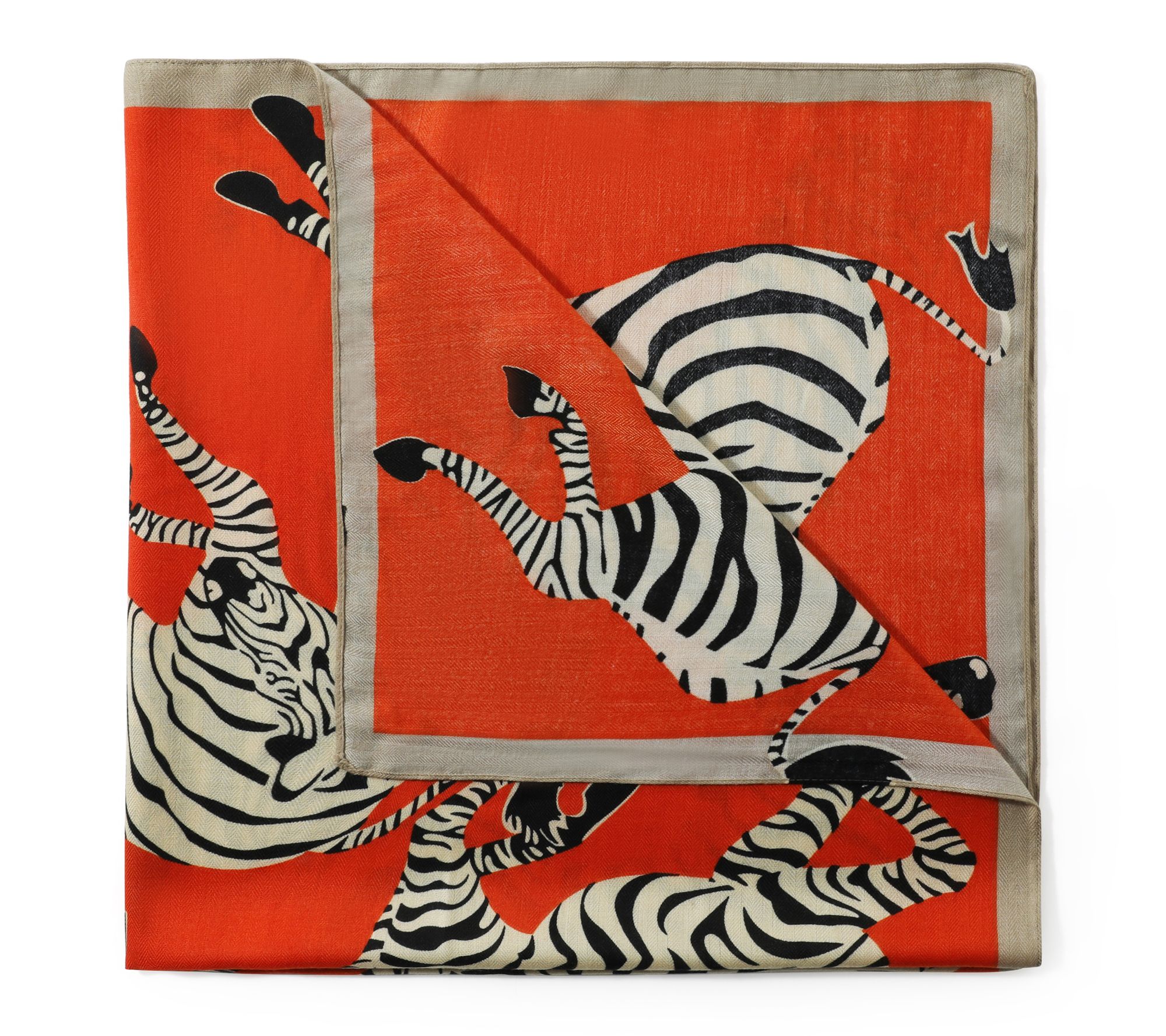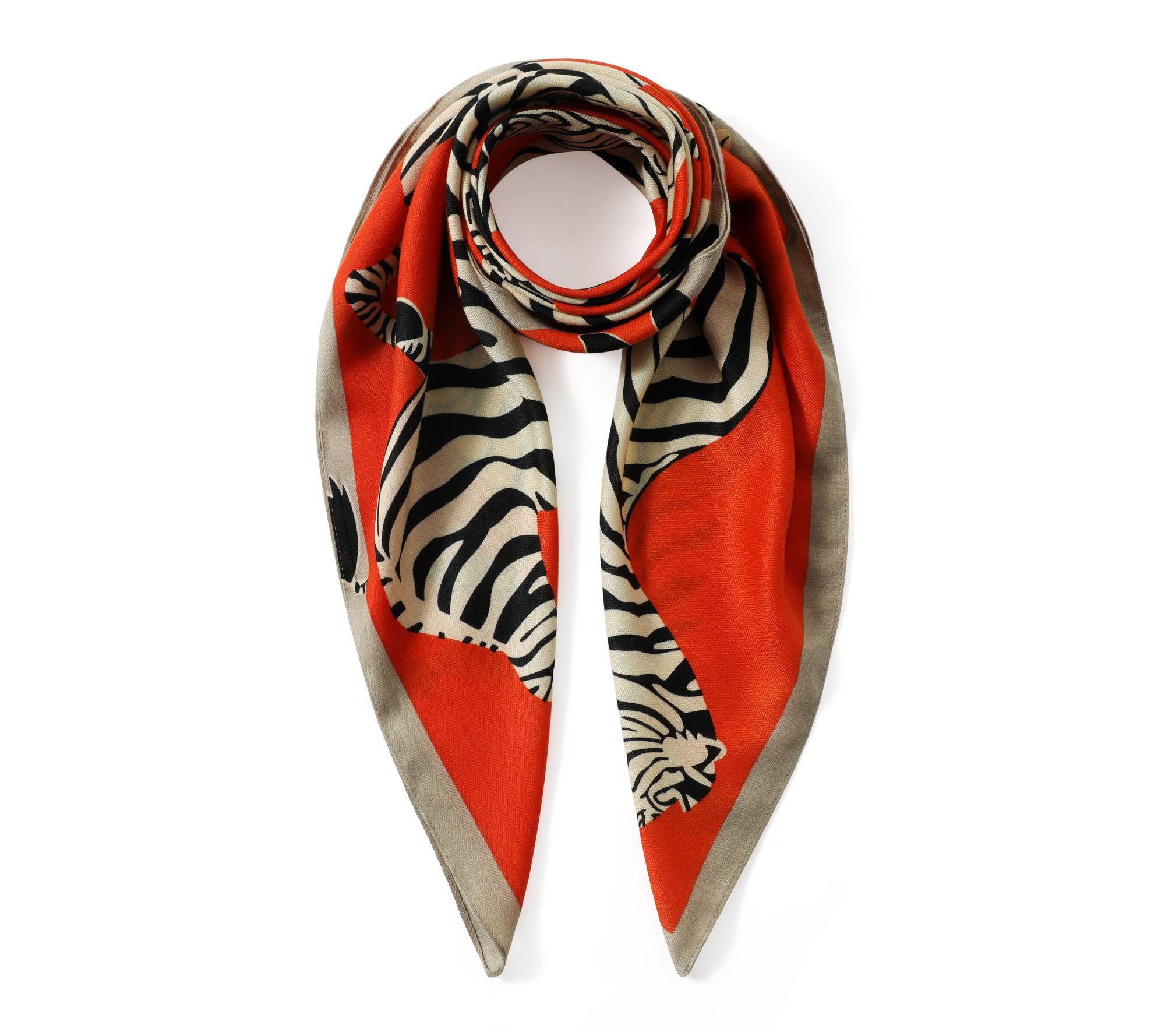 • Bold zebra print on burnt orange backdrop with neutral border