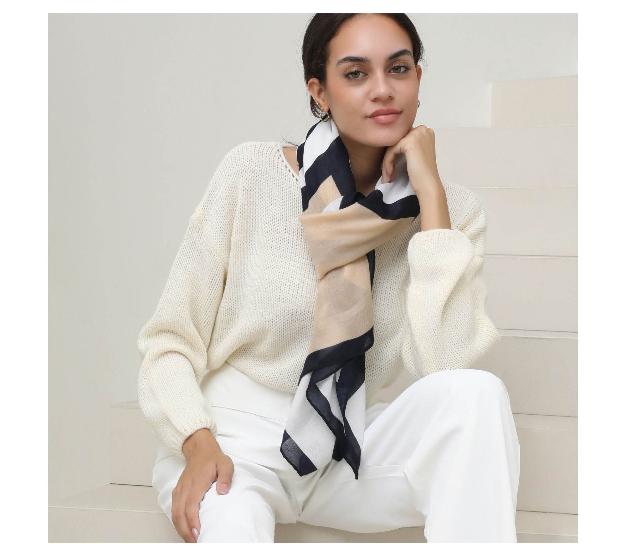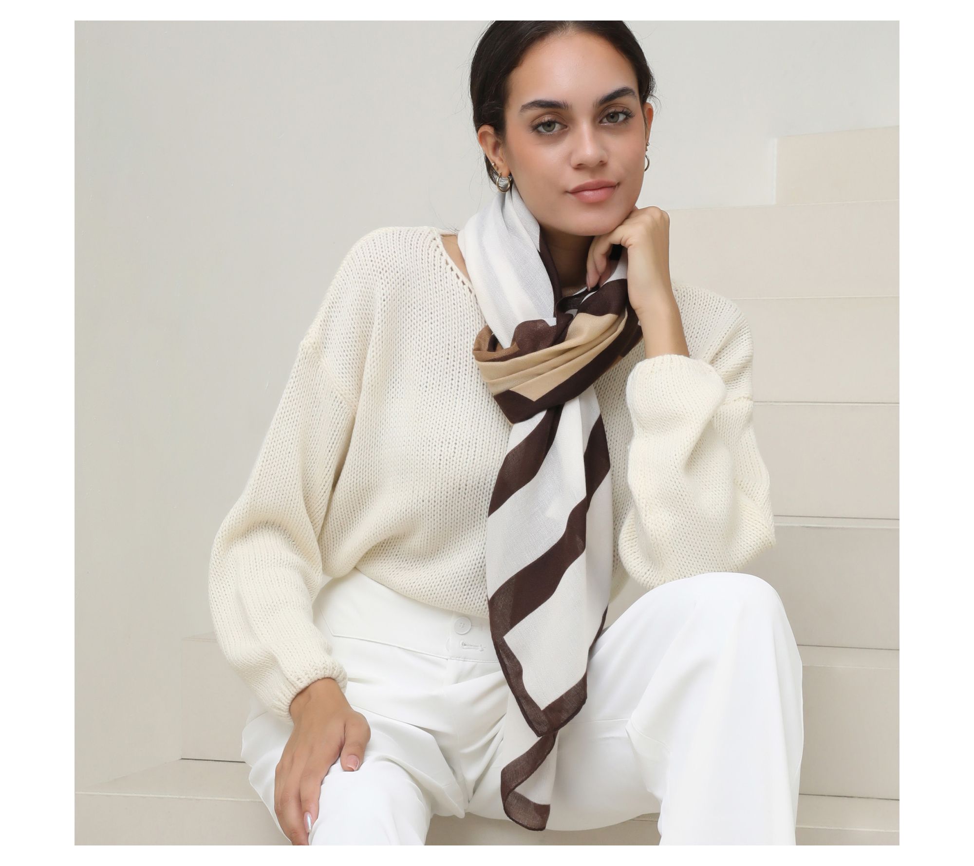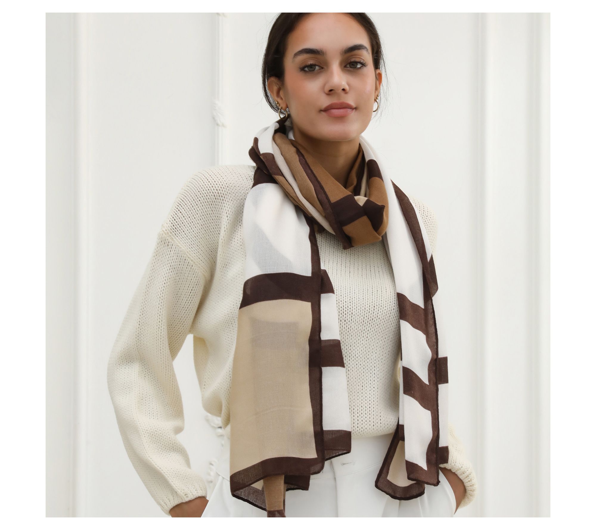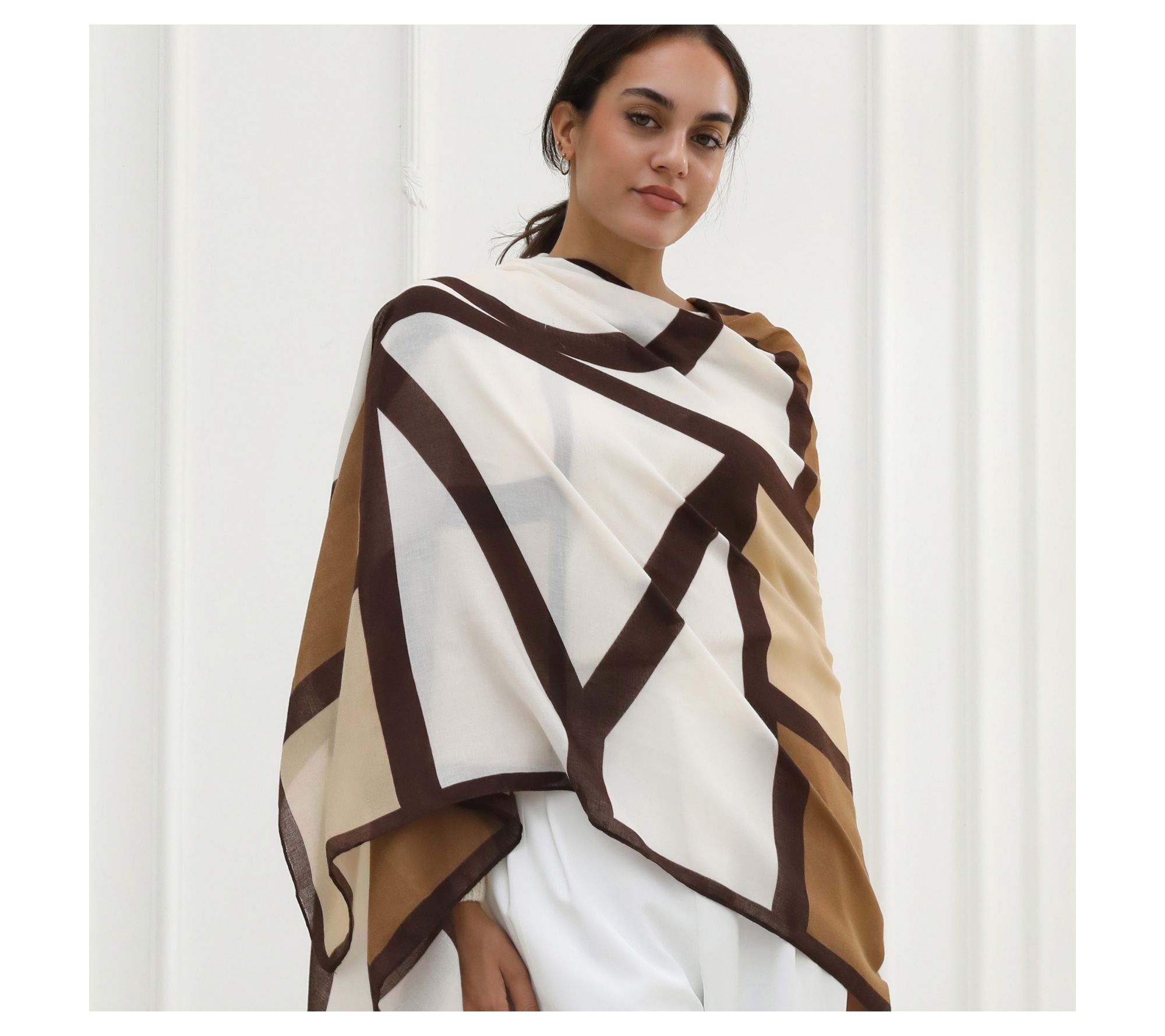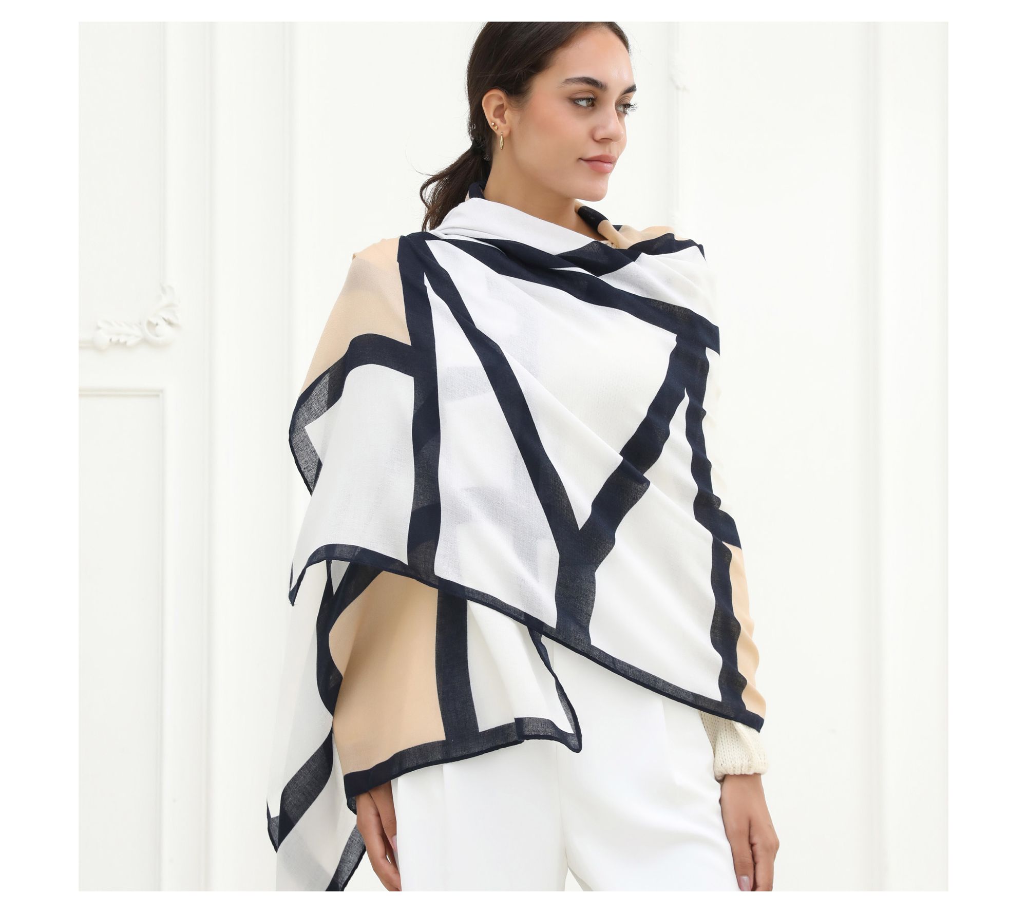 For an accessory that moves seamlessly from brunch to evenings out, this bold geometric scarf adds style and substance with its luxe feel and lightweight warmth. Try it draped over your shoulders, wrapped around your neck, or knotted for a chic finishing touch -- no matter how you wear it, versatility meets elegance. From Youzey.