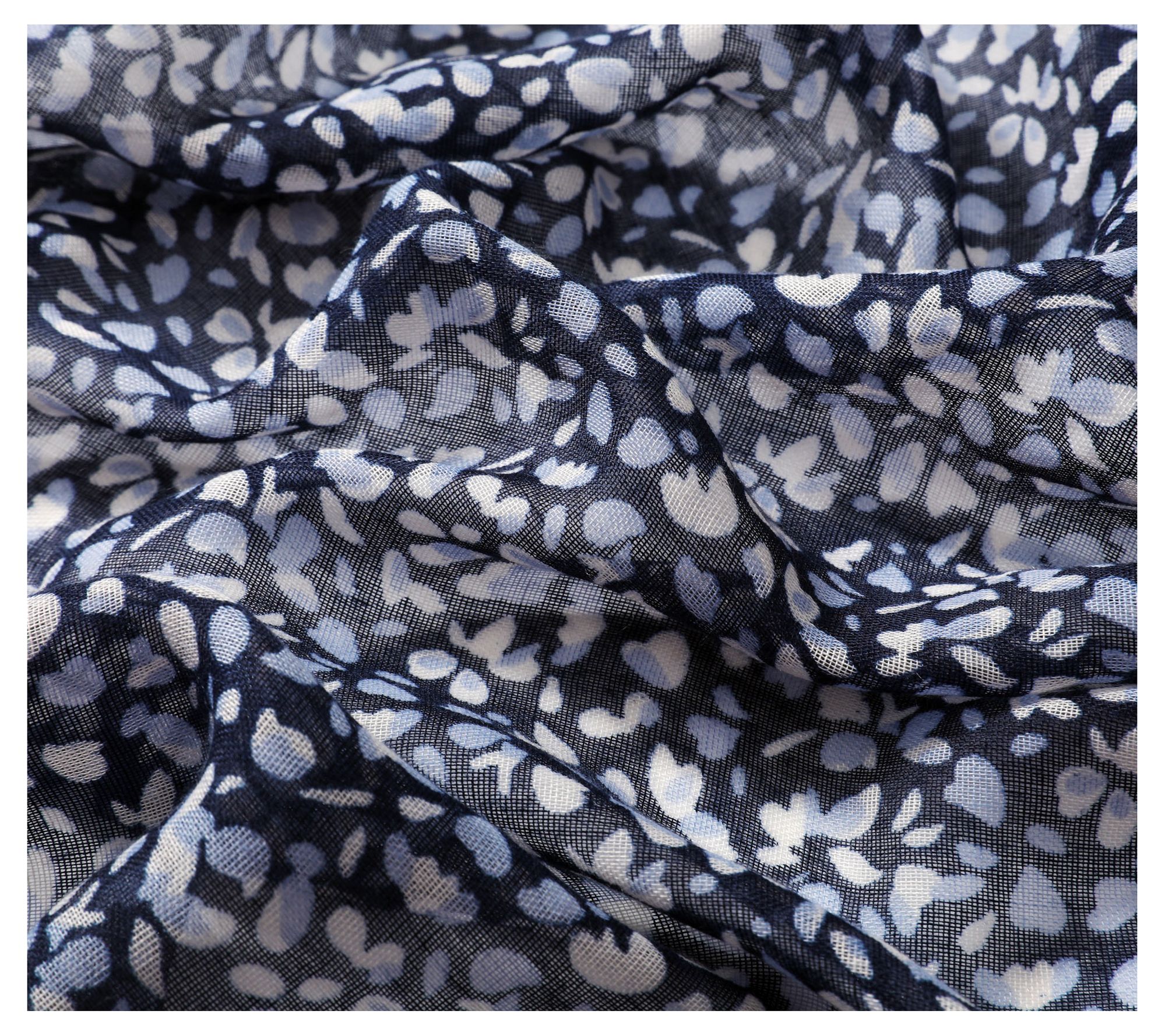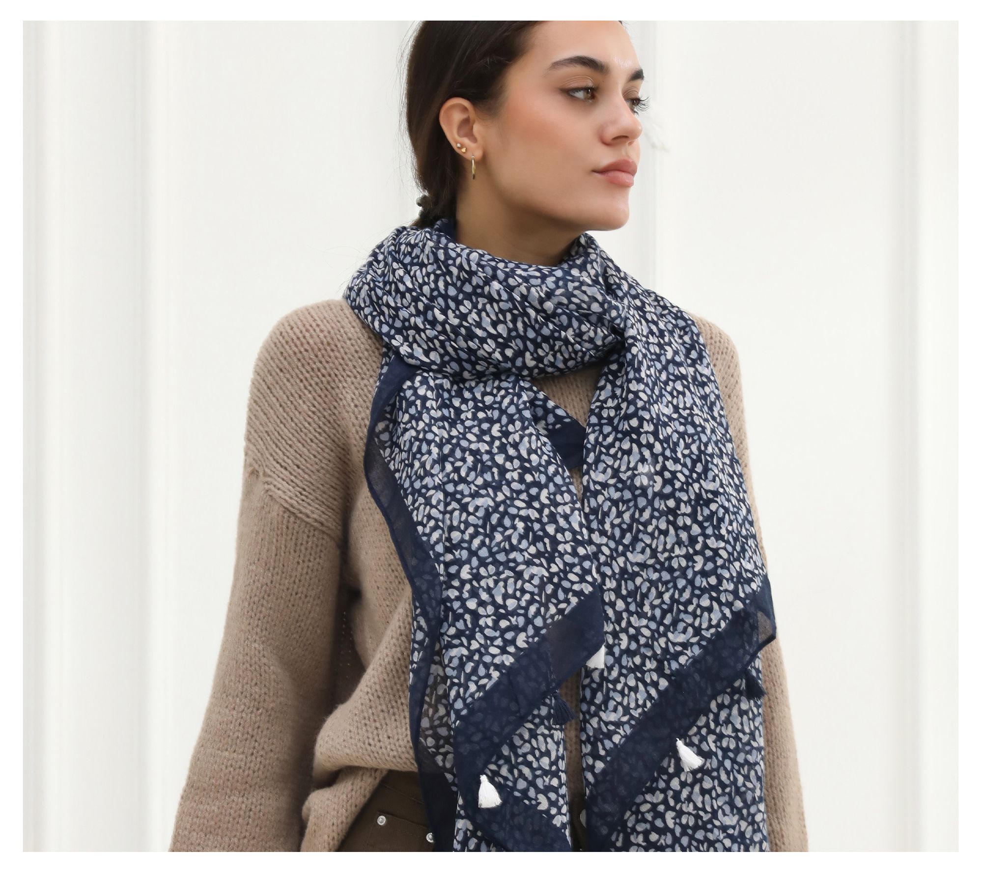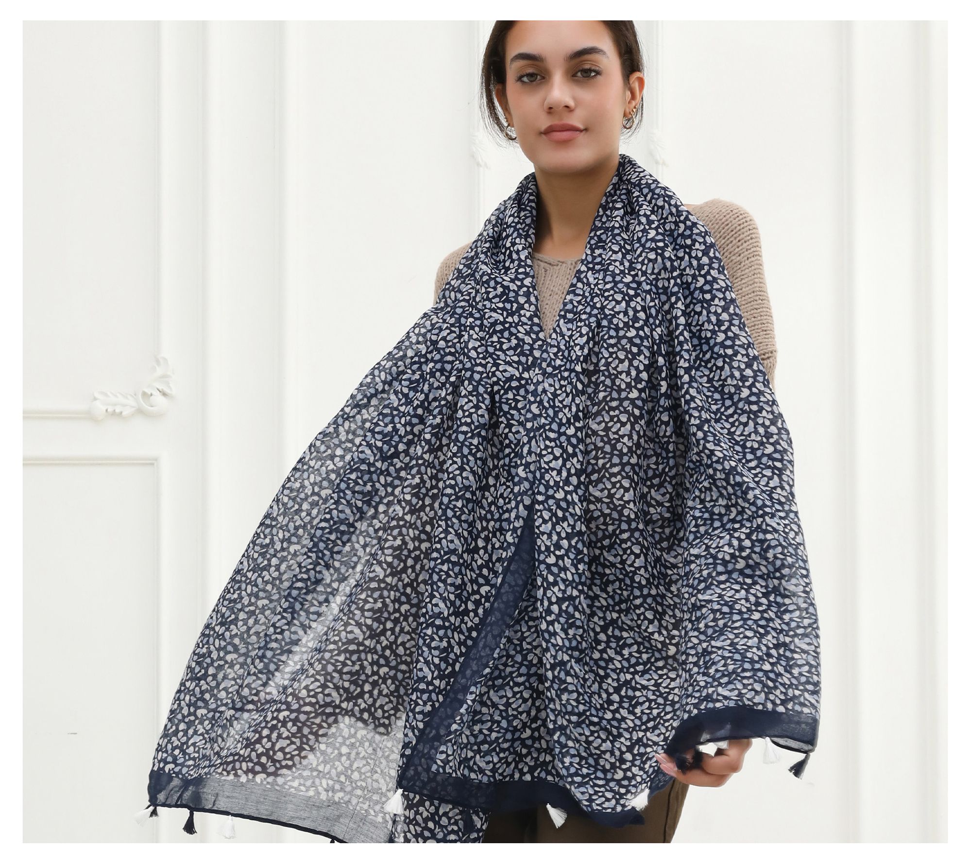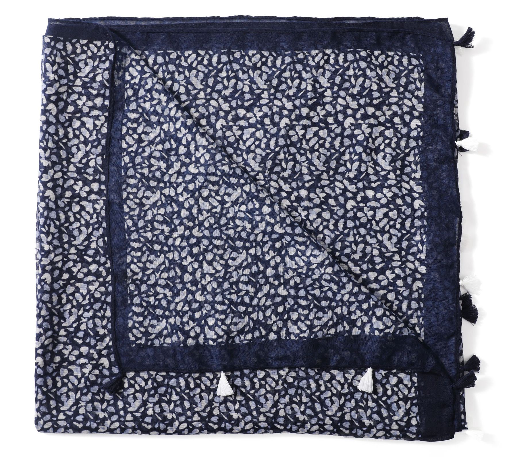 • Classic dark blue and white microprint; tassel trim; lightweight
