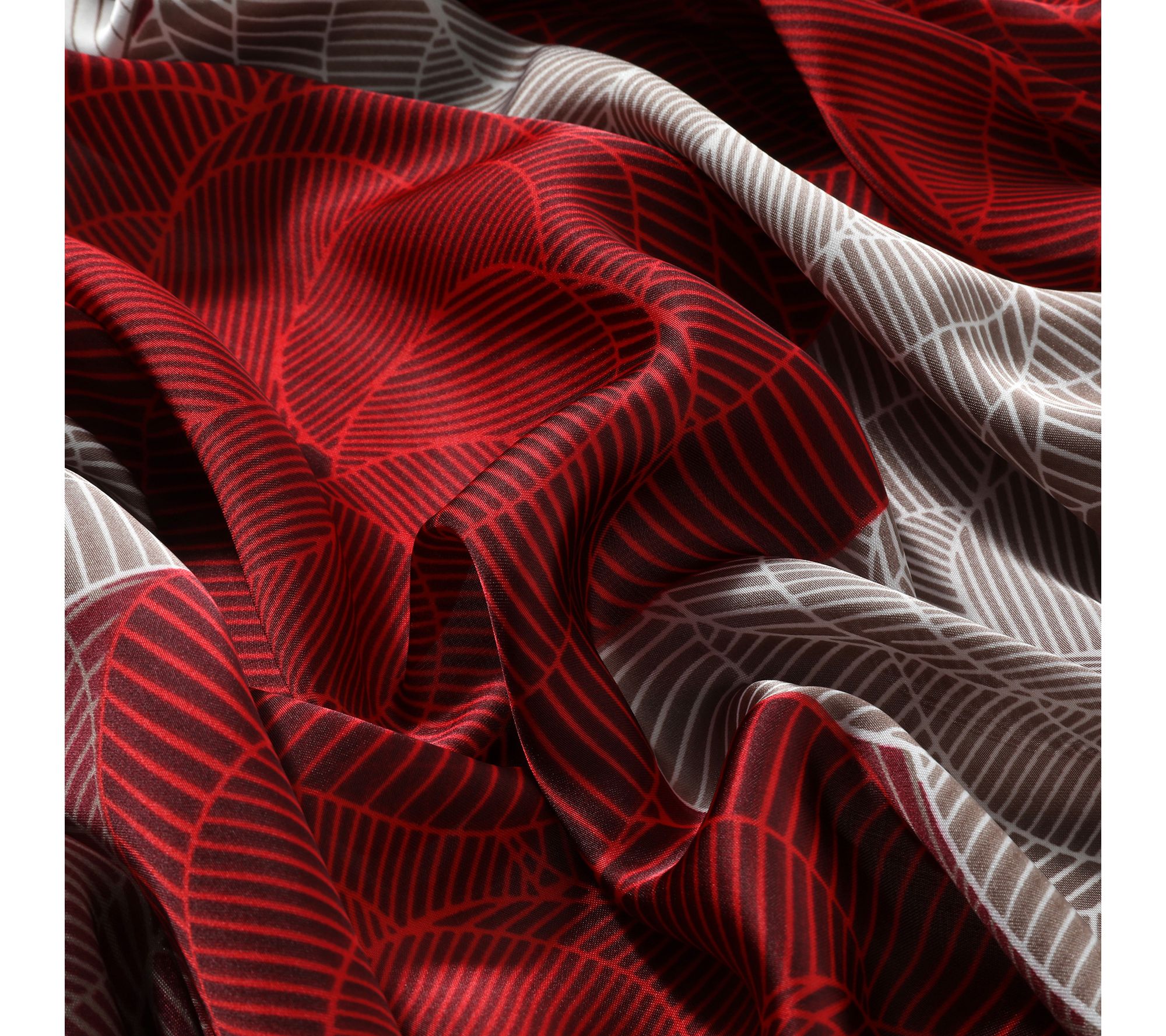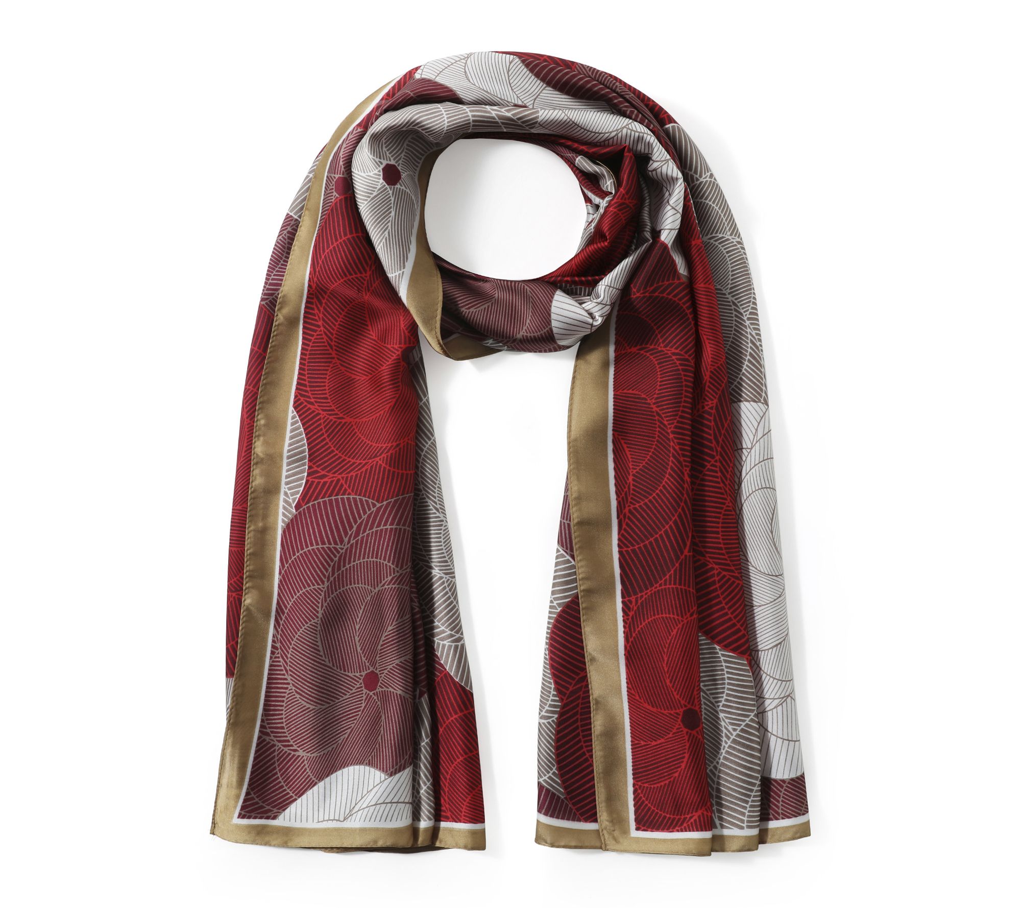 • Features: bold floral-inspired pattern in rich red tones with contrast accents, smooth lightweight satin silk, fluid drape, can be worn long, looped, layered, or as a shoulder wrap