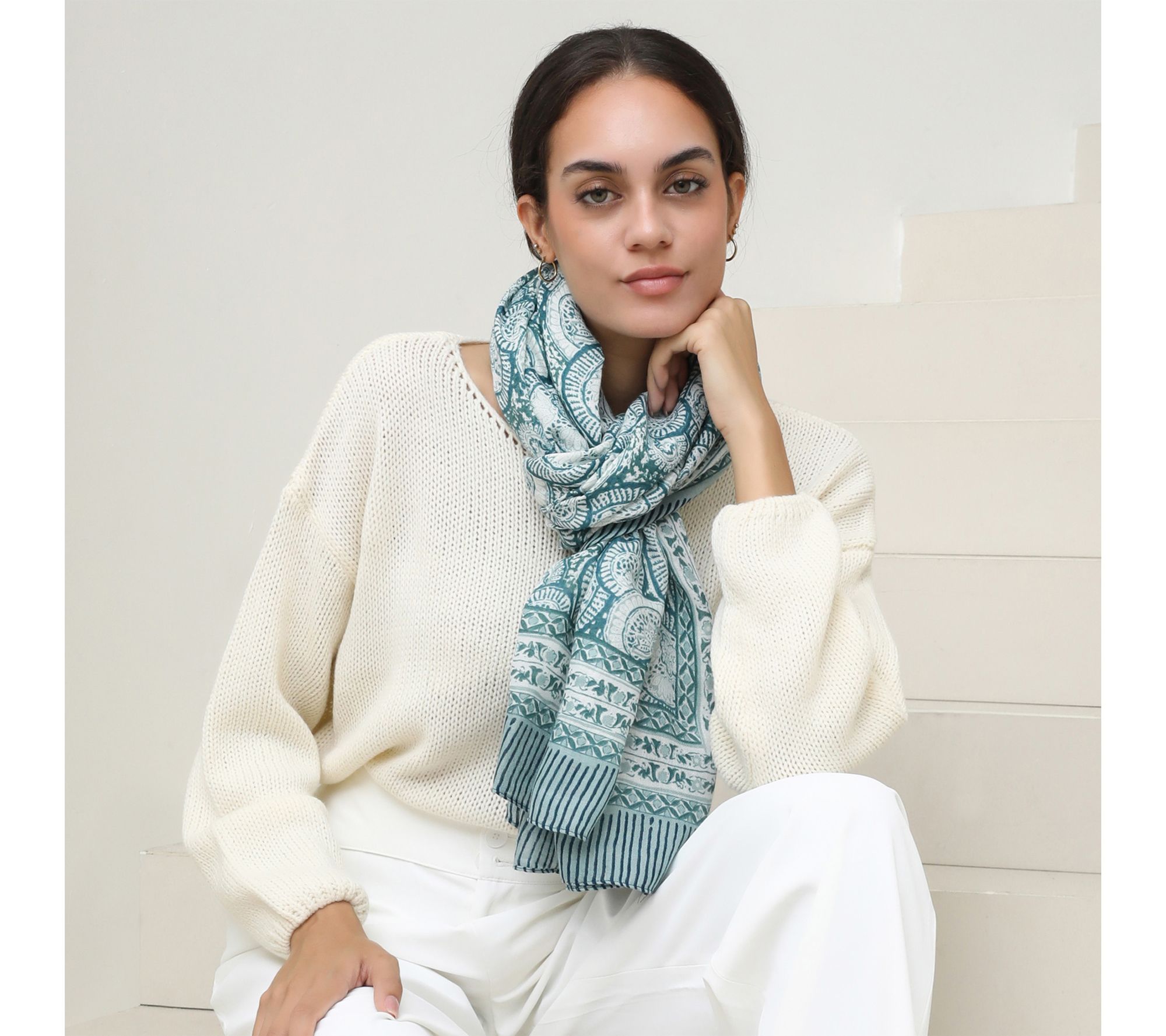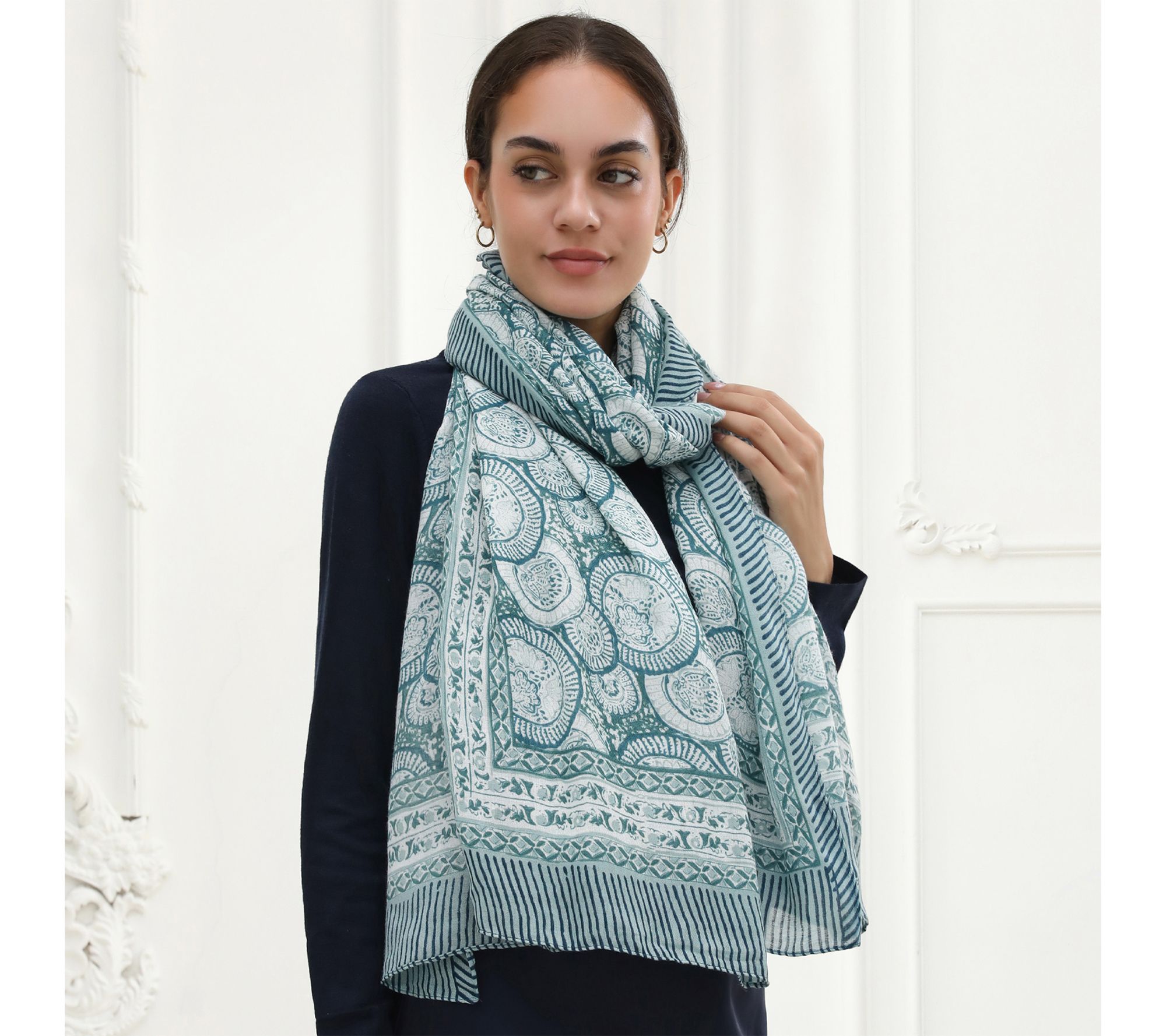 Soft knit texture and a generous size make this scarf a go-to for layering through every season. The paisley-inspired pattern in muted blue-green tones brings subtle elegance, whether you’re styling it as a shawl for an evening out or wrapping up for a cozy commute. From Youzey.