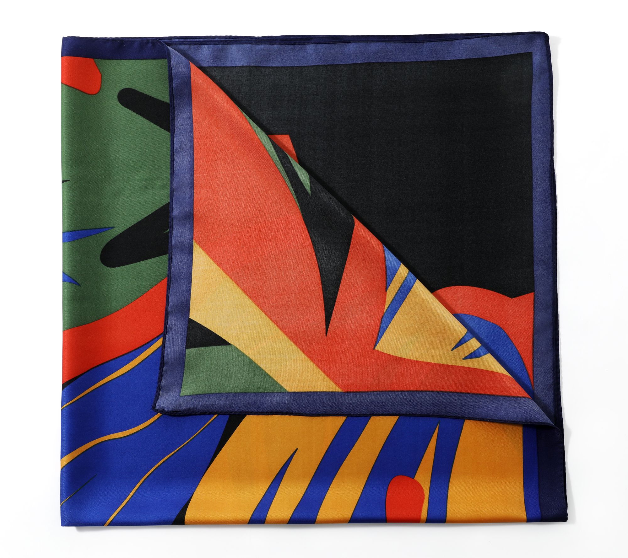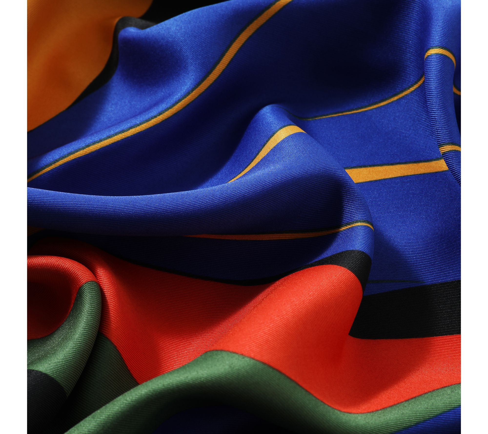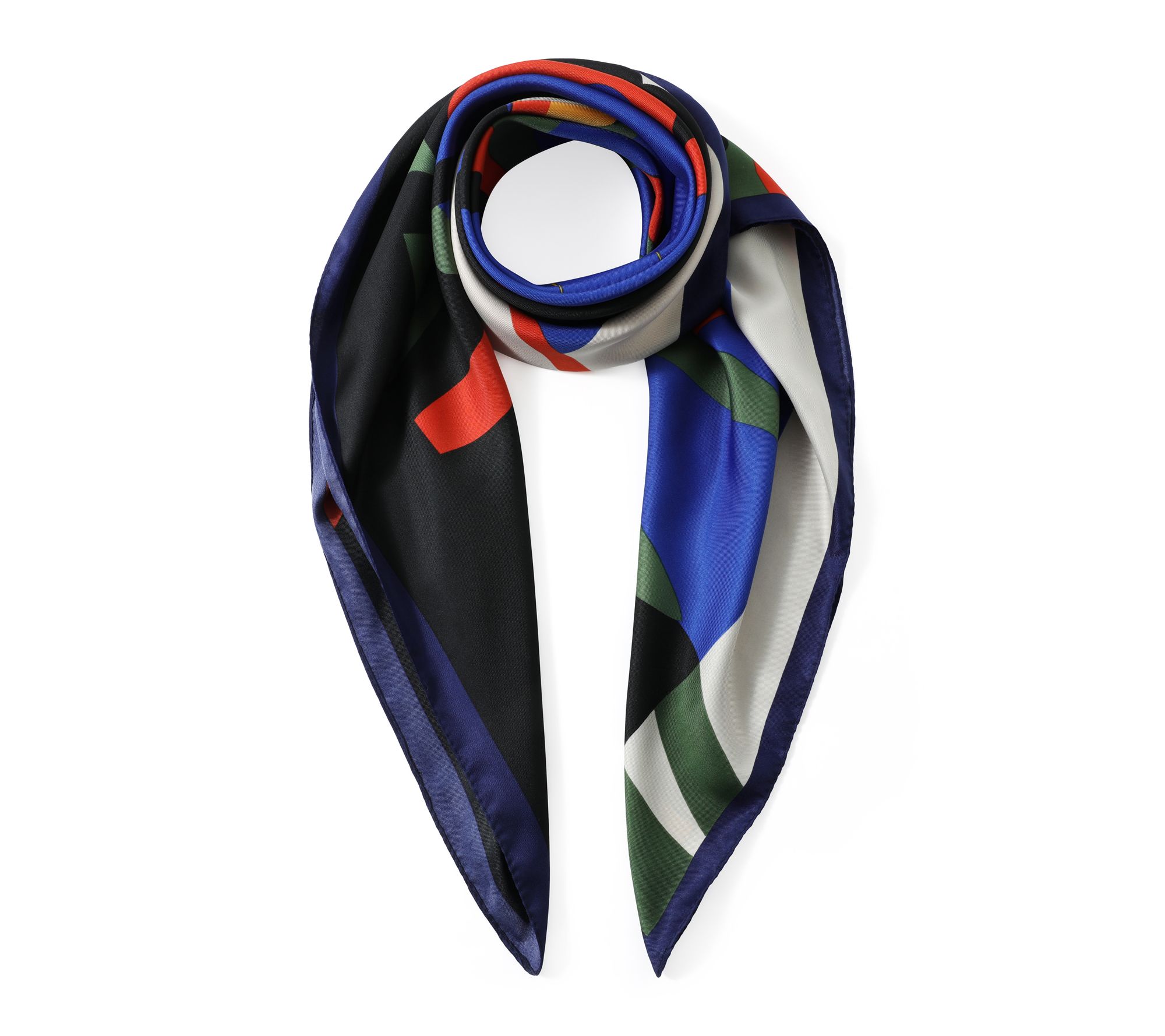 Whether you're dressing up a classic white shirt or adding flair to your favorite denim, this lightweight scarf delivers a splash of bold color and artistic energy. The striking blocks of navy, green, and orange give everyday looks a fresh twist, while its silky satin texture invites endless styling options. From Youzey.