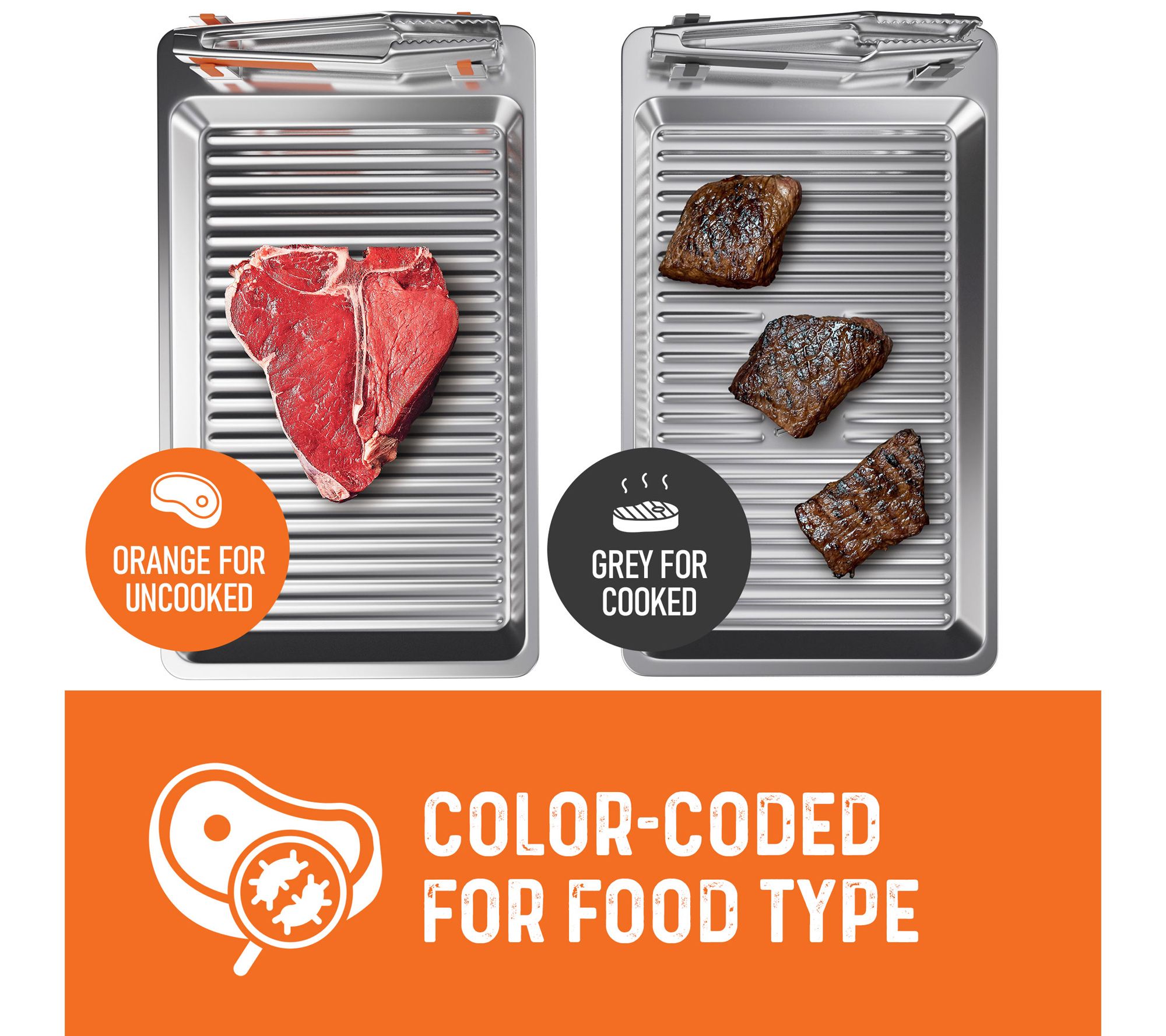 • Includes two color-coded trays (orange and grey) and matching tongs
