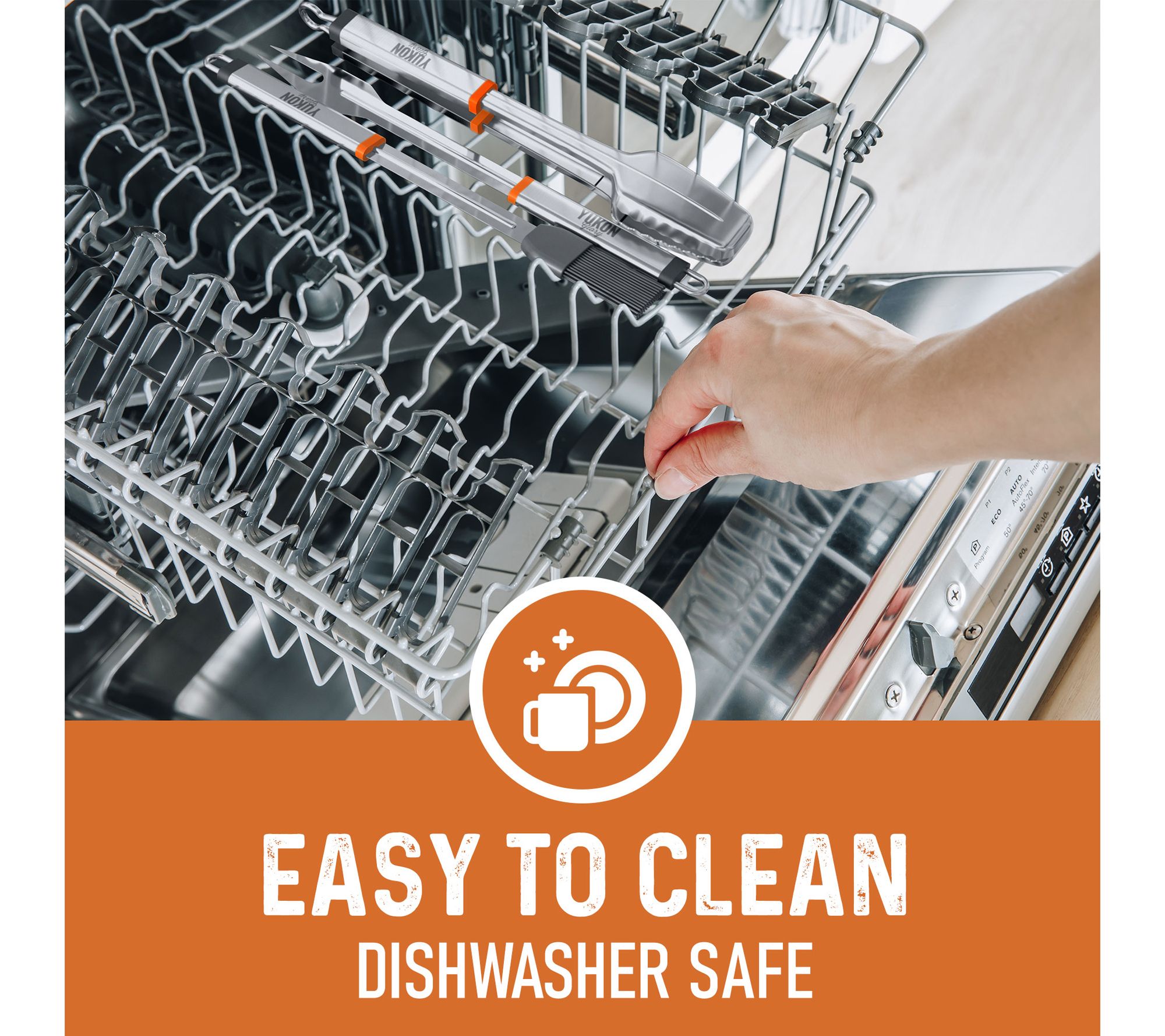 • Includes spatula, tongs, fork, brush, and rotating drip tray
