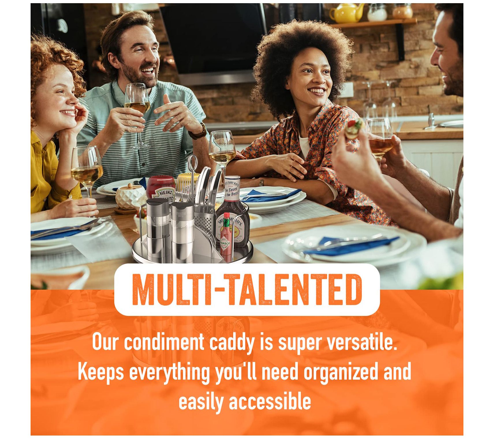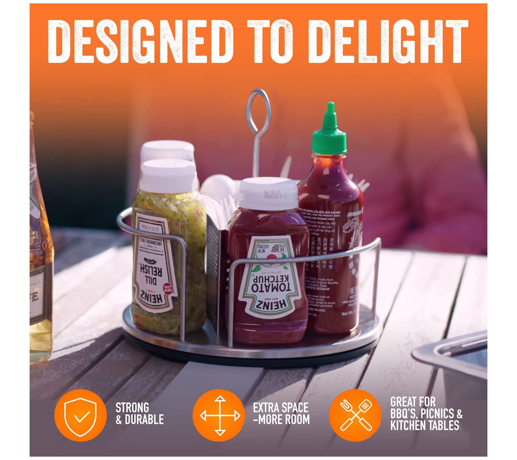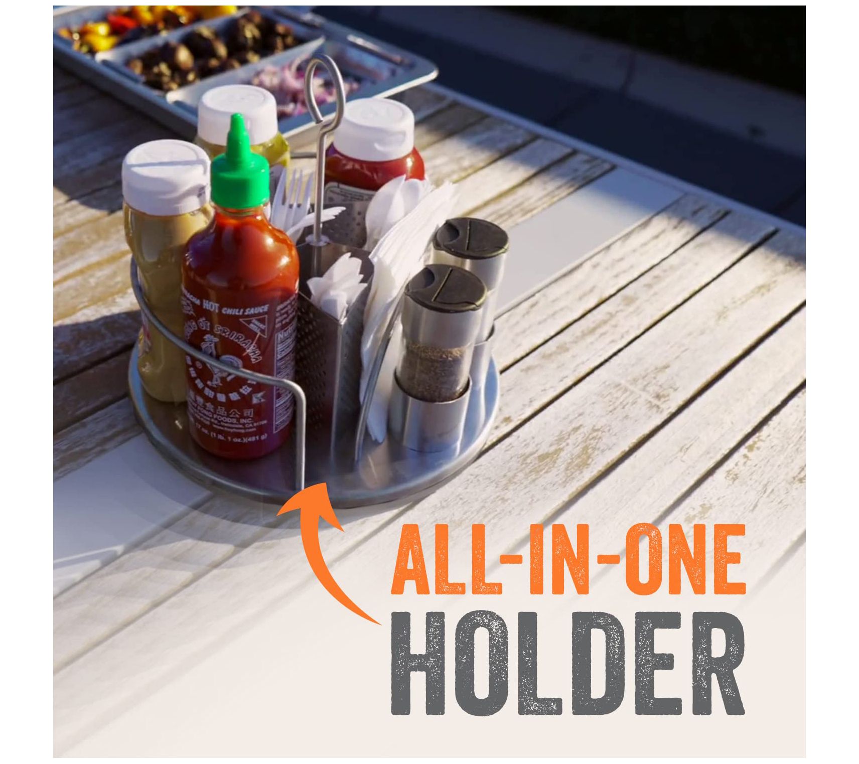 • Three cutlery compartments, napkin slot, and space for up to five condiments