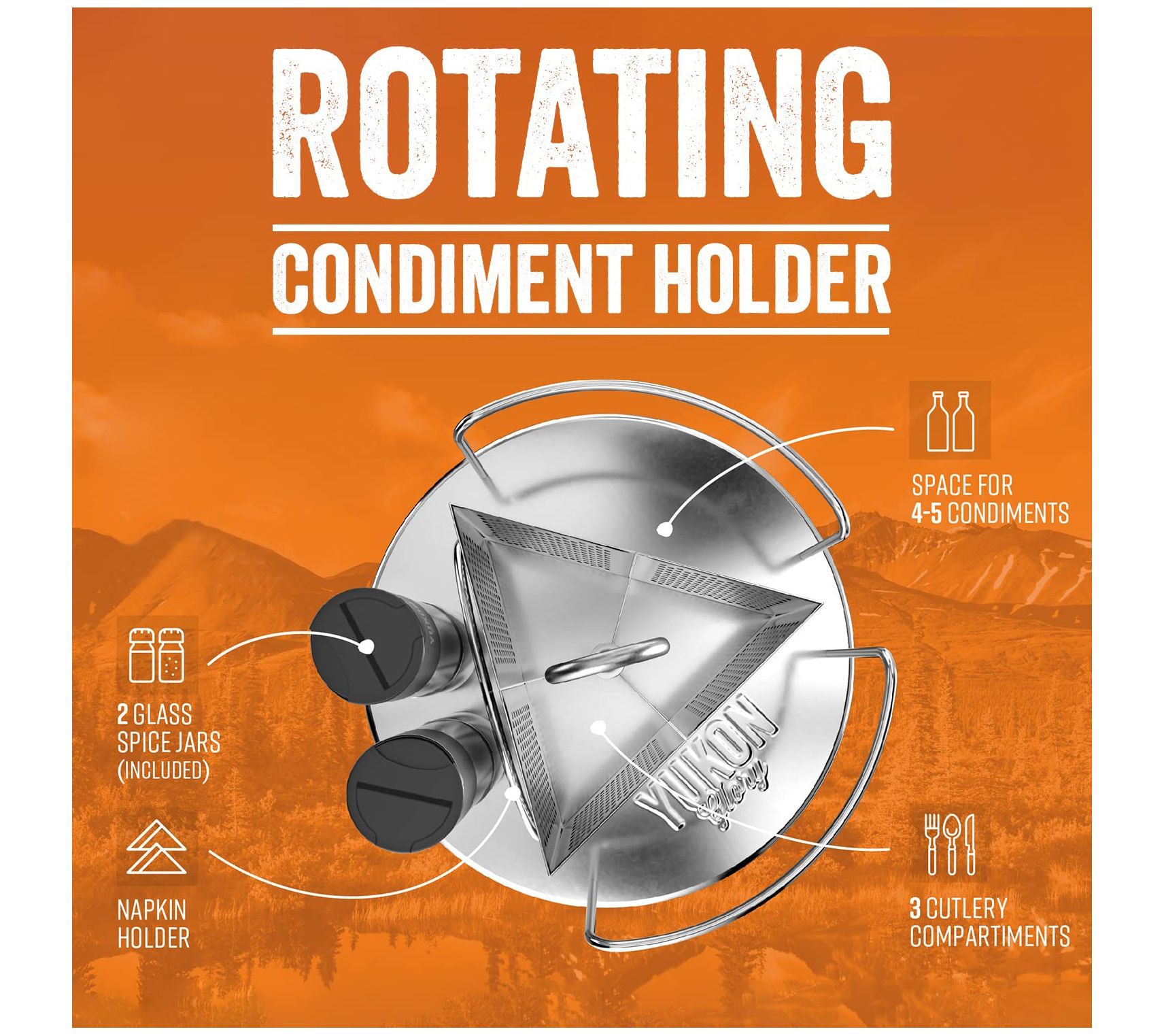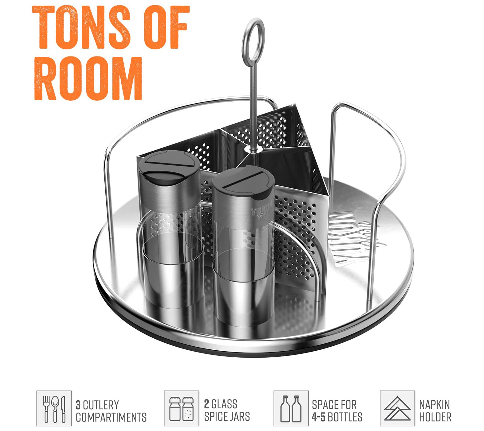 Keep your BBQ space tidy and organized when you have this rotating caddy that features sleek stainless steel construction and plenty of space for condiments, cutlery, spices, and napkins. From Yukon Gold.