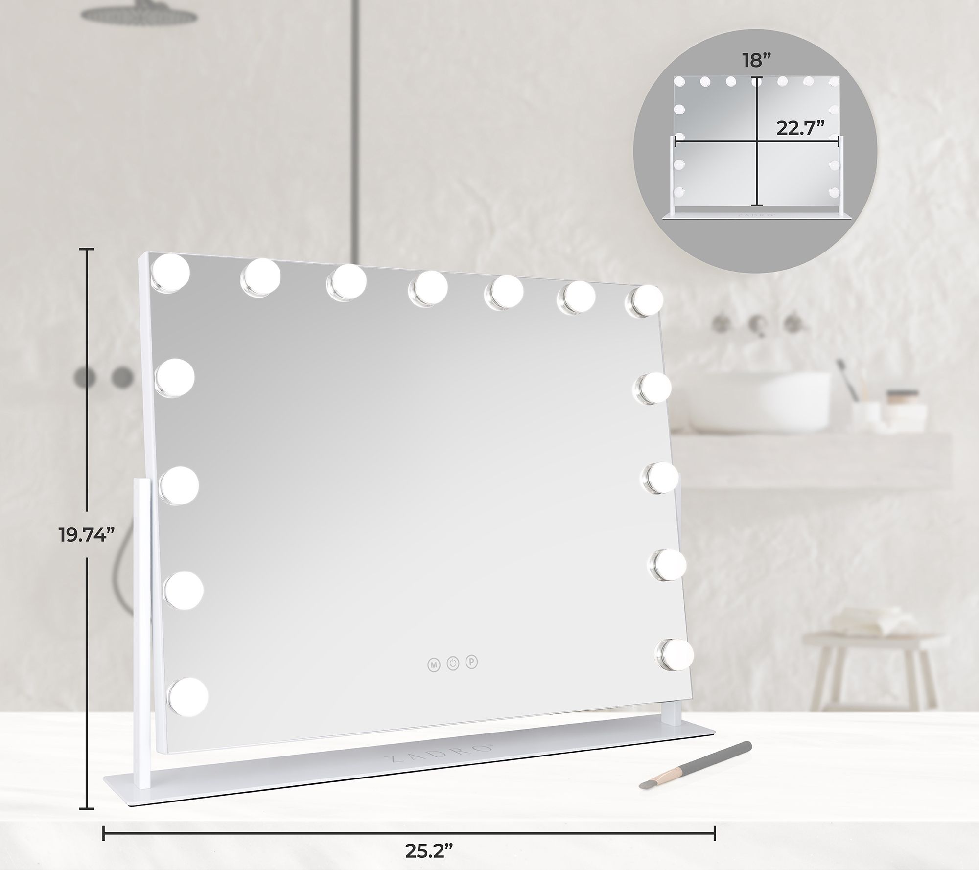 • Measures approximately 25.2"W x 3.94"D x 19.75"H; mirror head 22.75"W x 18.25"H; Cord 57"L