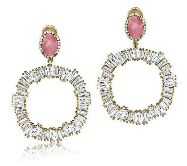 • Design details: Baguette-cut cubic zirconia hoop drops from a pink crystal oval post; prong and pave stone setting
