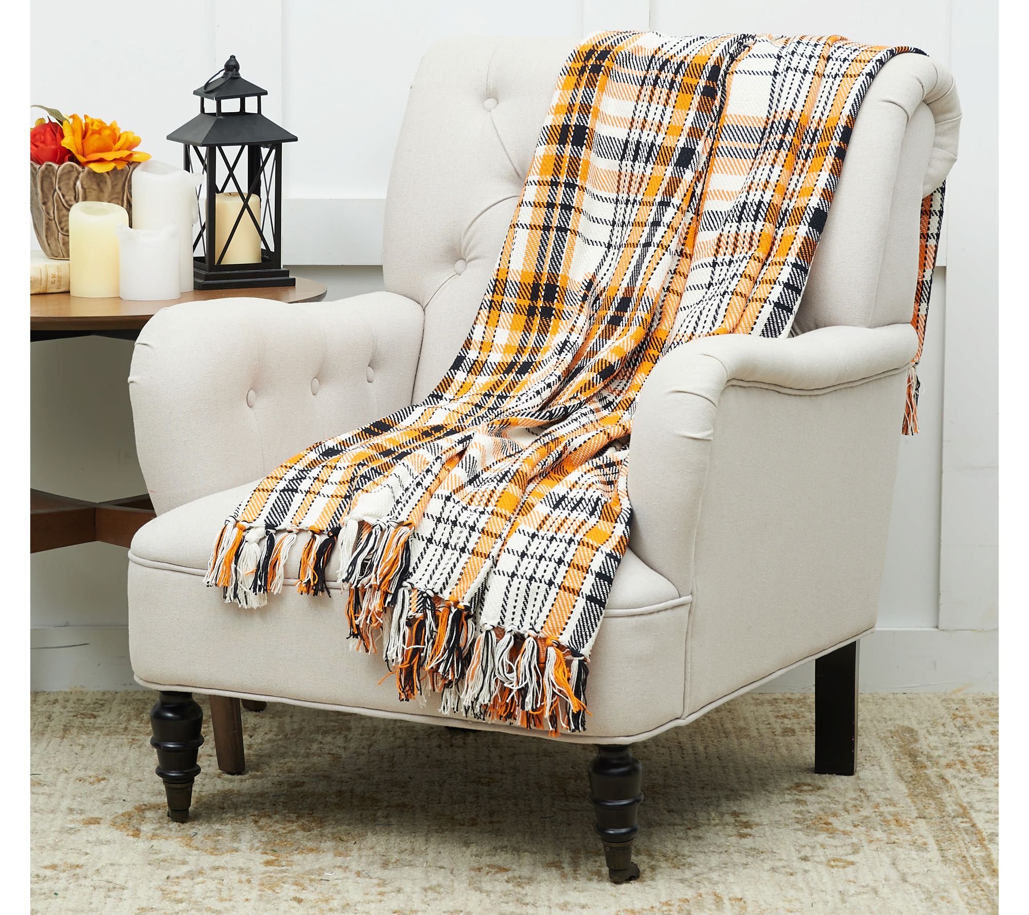 Curl up in comfort with the Zelda plaid throw, a delightful companion for cozy nights at home. The woven cotton fabric and warm orange and black plaid design invite you to embrace the season, making this throw an ideal addition to your fall decor. Whether draped over a favorite chair or wrapped around you during a chilly evening, it effortlessly adds a touch of classic style to your space. Perfectly pair it with seasonal accents or enjoy it on its own. From the Valerie Parr Hill Collection.