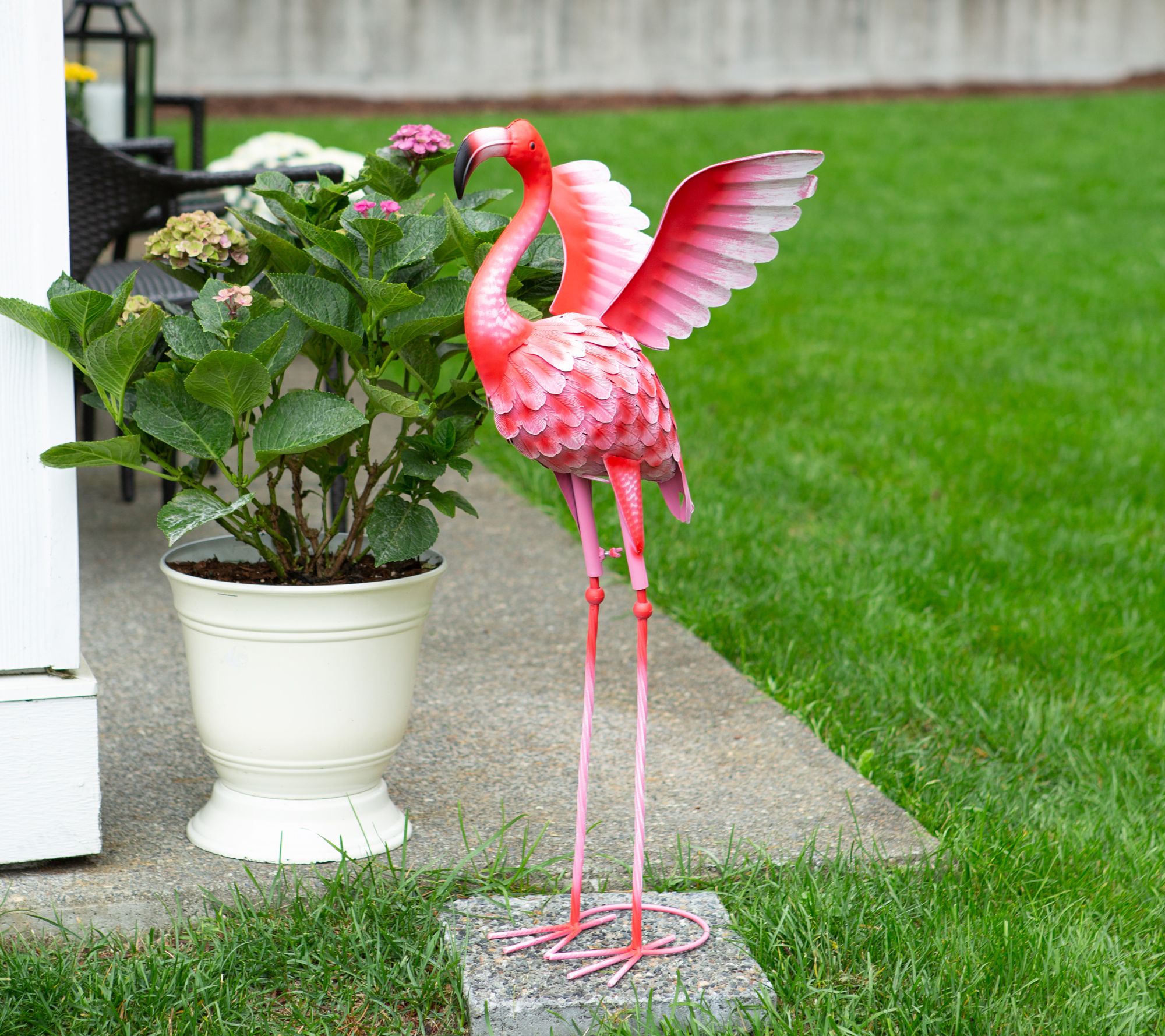 Add a touch of whimsy to your garden with this flying flamingo garden statue. Textured feathers and exquisite detailing make it a charming addition to your outdoor space. Perfect for spring and summer decor, it effortlessly enhances any area with its playful, tropical design. From Zingz & Things.