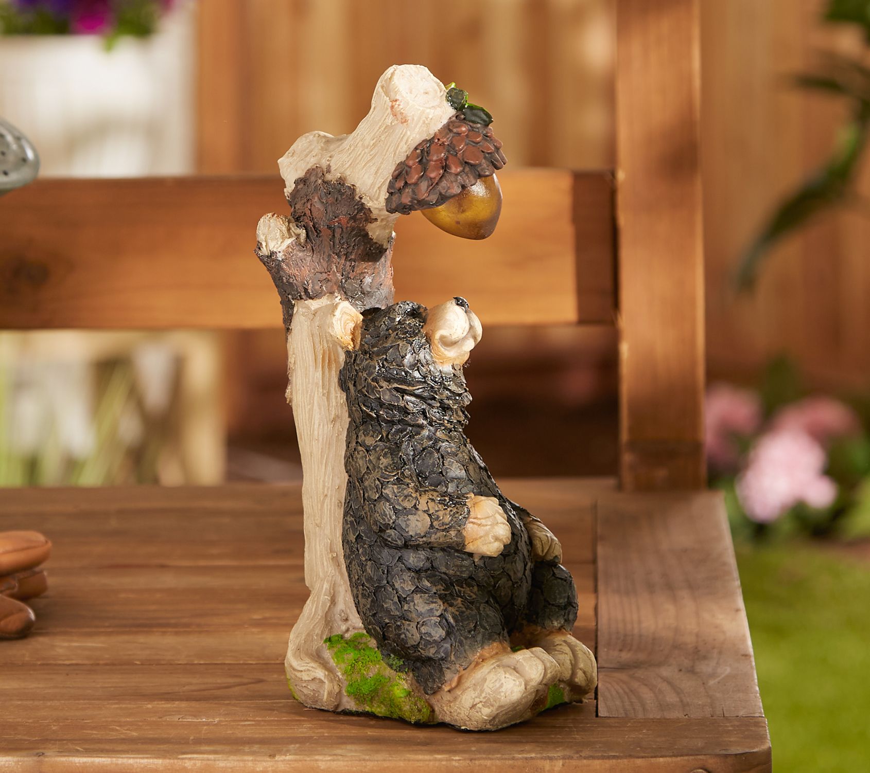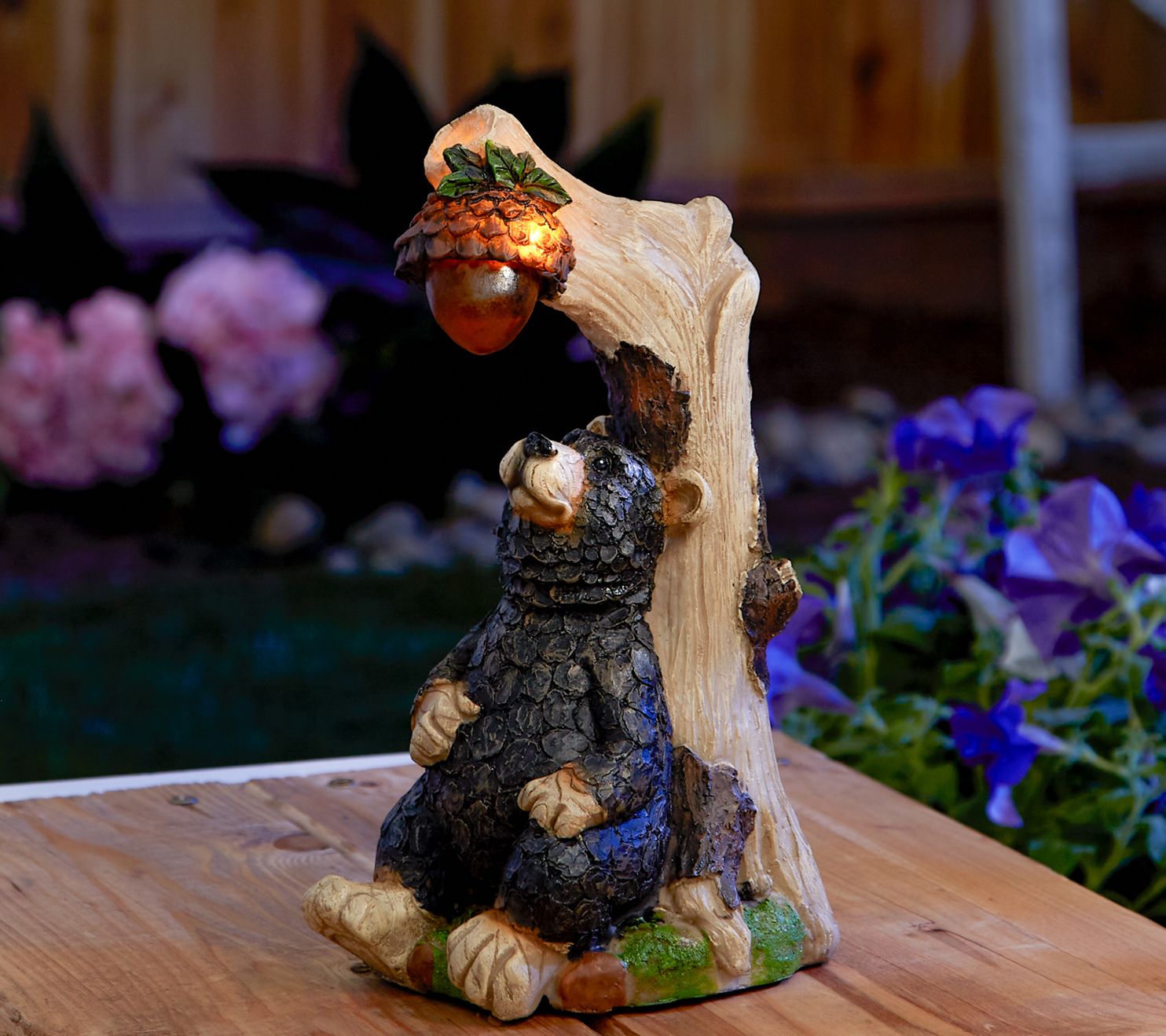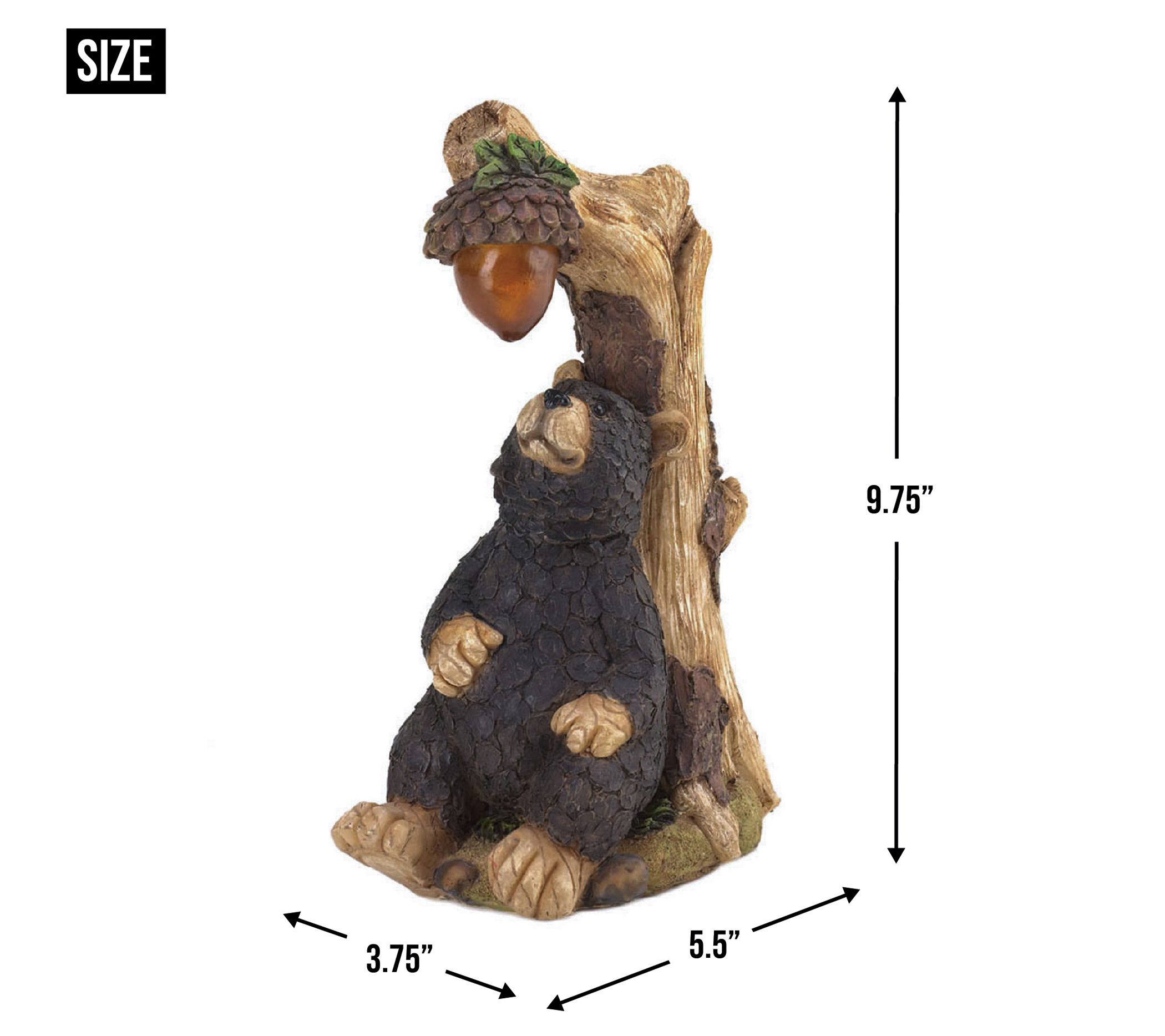 Relaxing under a tree and gazing up at an acorn that illuminates after dark, this adorable black bear is ready to bring woodland charm to your yard or garden. From Zingz & Thingz.