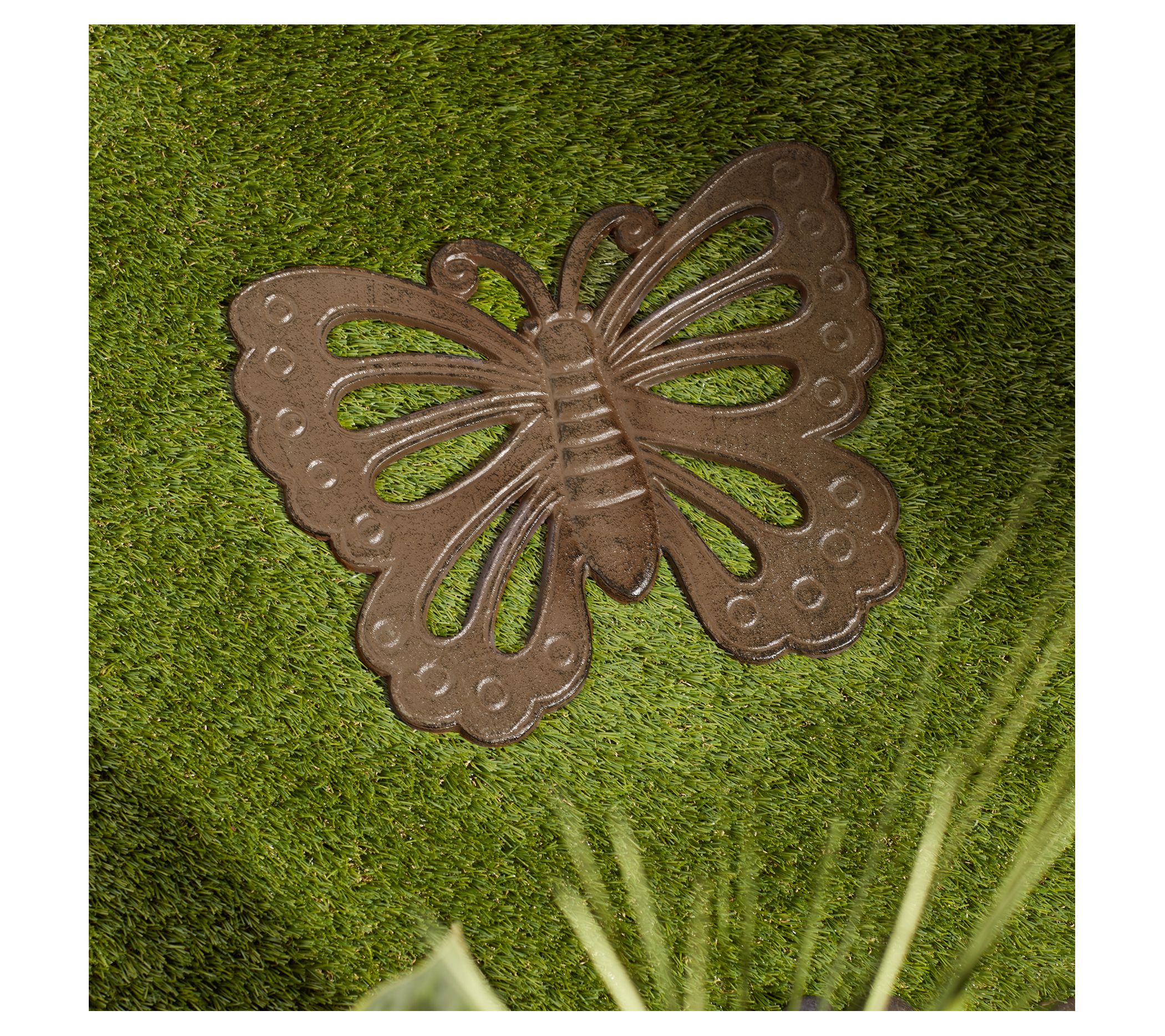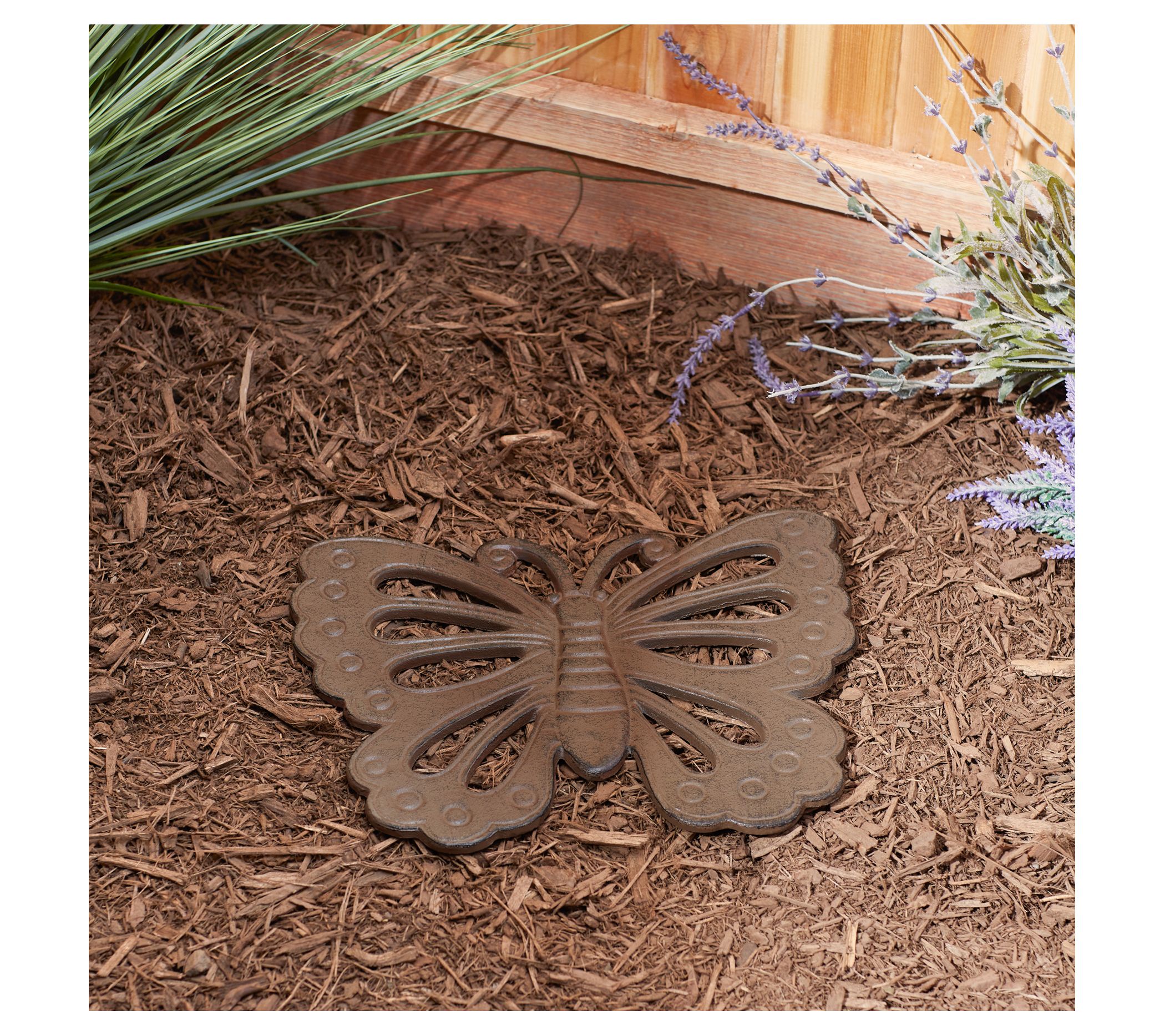 Enhance your garden with this cast iron butterfly stepping stone. Perfect for marking a pathway or flower bed, this decorative piece adds charm and appeal to any outdoor space. Simply place it in your desired location to create a lovely personalized touch. From Zingz & Thingz.