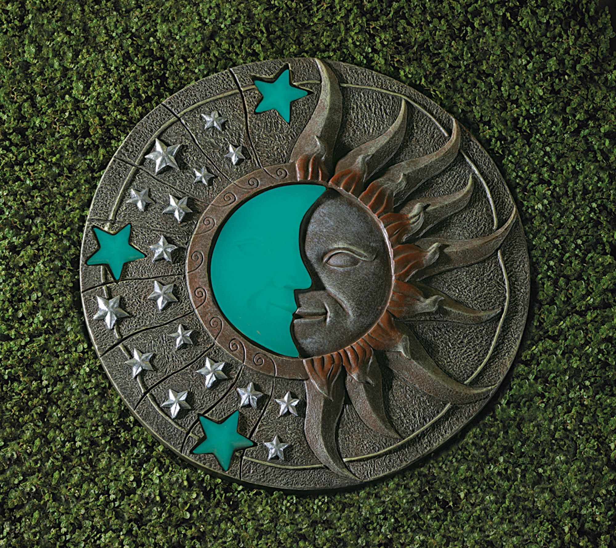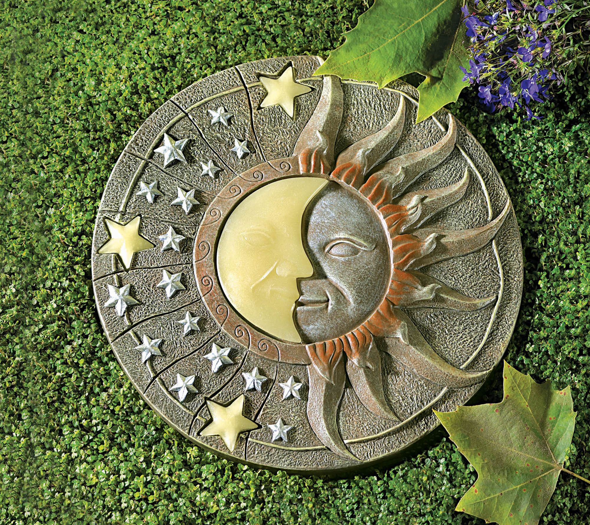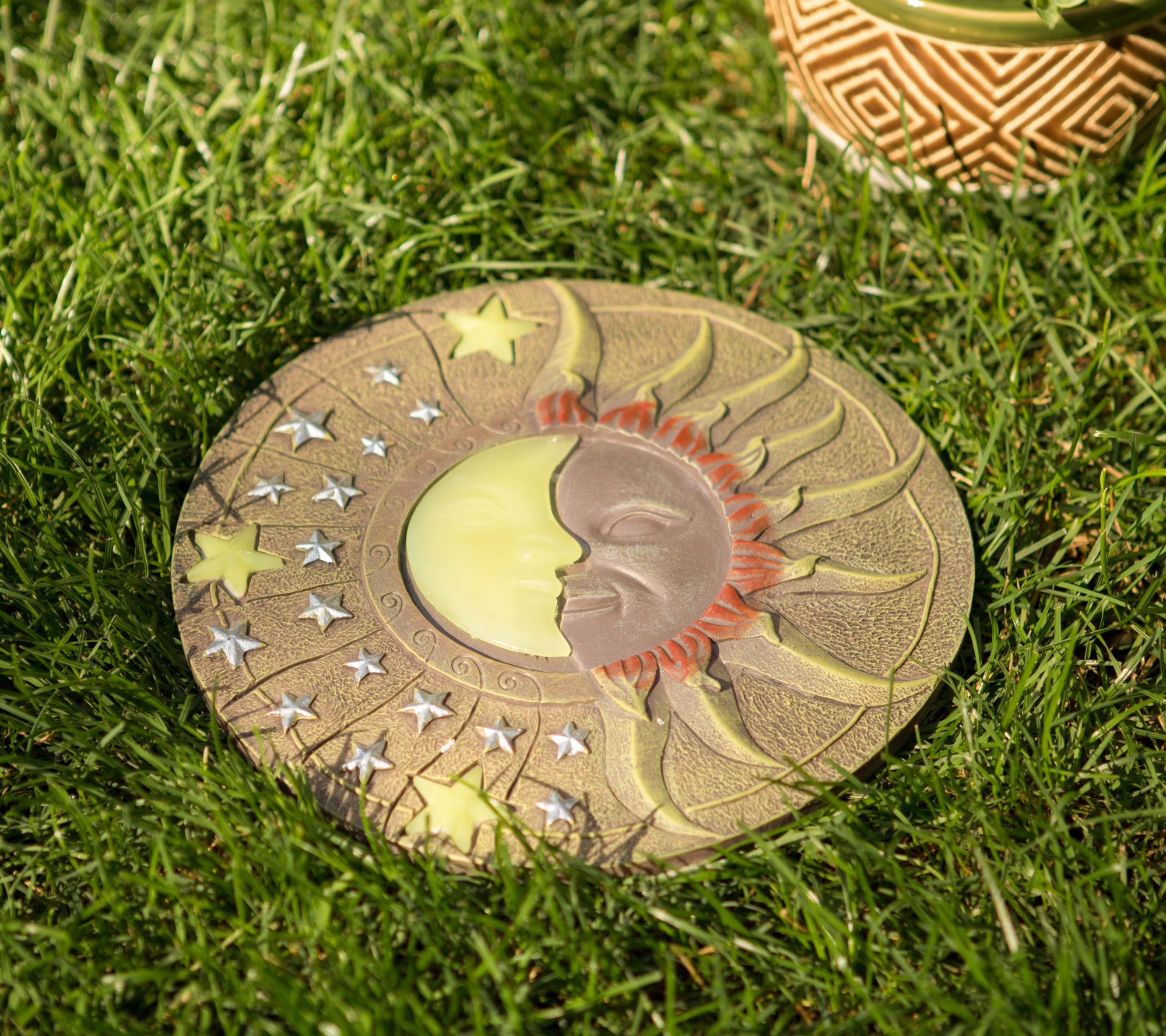 Cast a gentle glow around your garden with this Sun & Moon glowing stepping stone. Perfect for your walkway, flowerbed, or pond, it soaks up the sun during the day and allows the moon and stars to glow by night. From Zingz & Thingz.