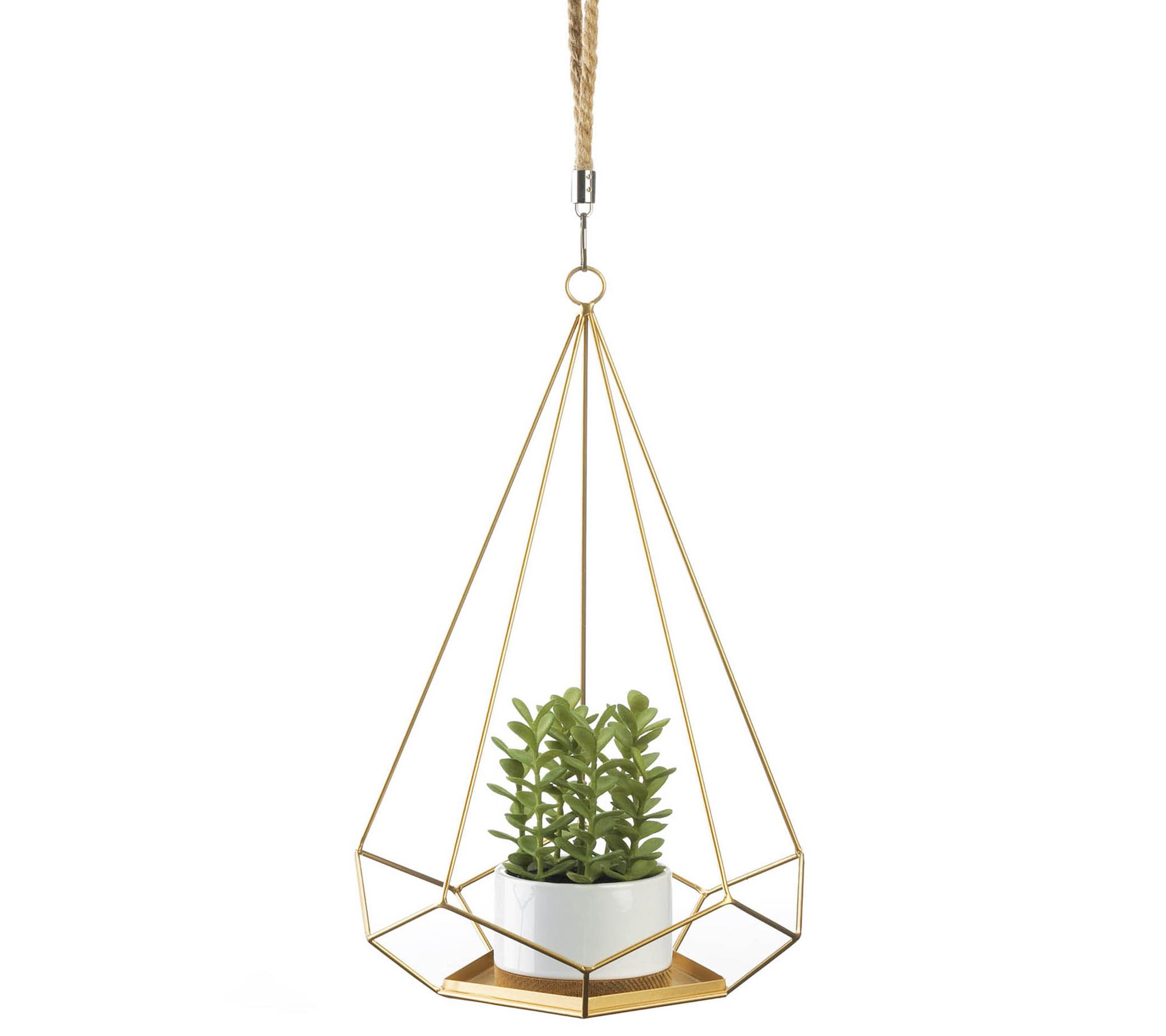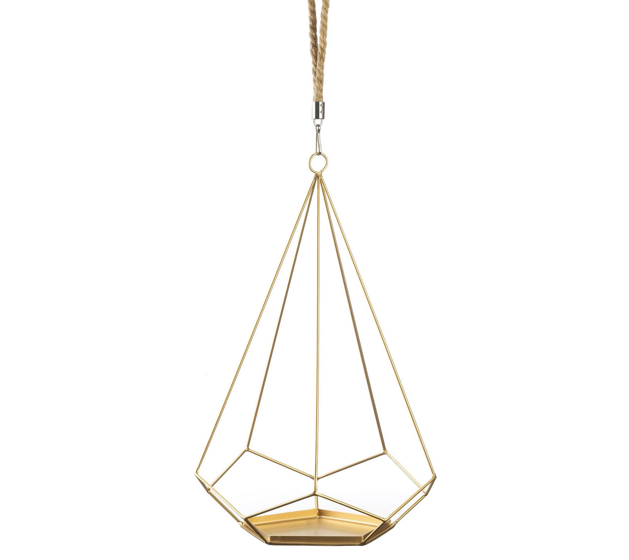 Give your hanging plant a lasting home with this unique plant holder boasting an eye-catching faceted design inspired by crystals and prisms. Simply install on your patio or porch and place a planter on the interior tray to give growing leaves and vines plenty of room to sway with the breeze. The iron frame and rope support are ready for indoor or outdoor display. From Zingz & Thingz.
