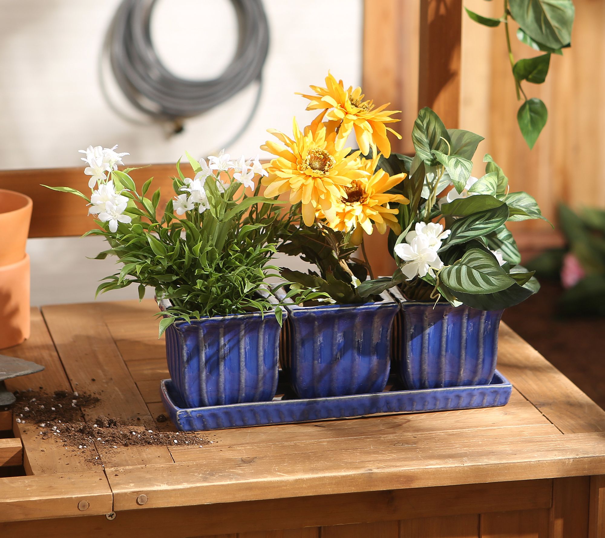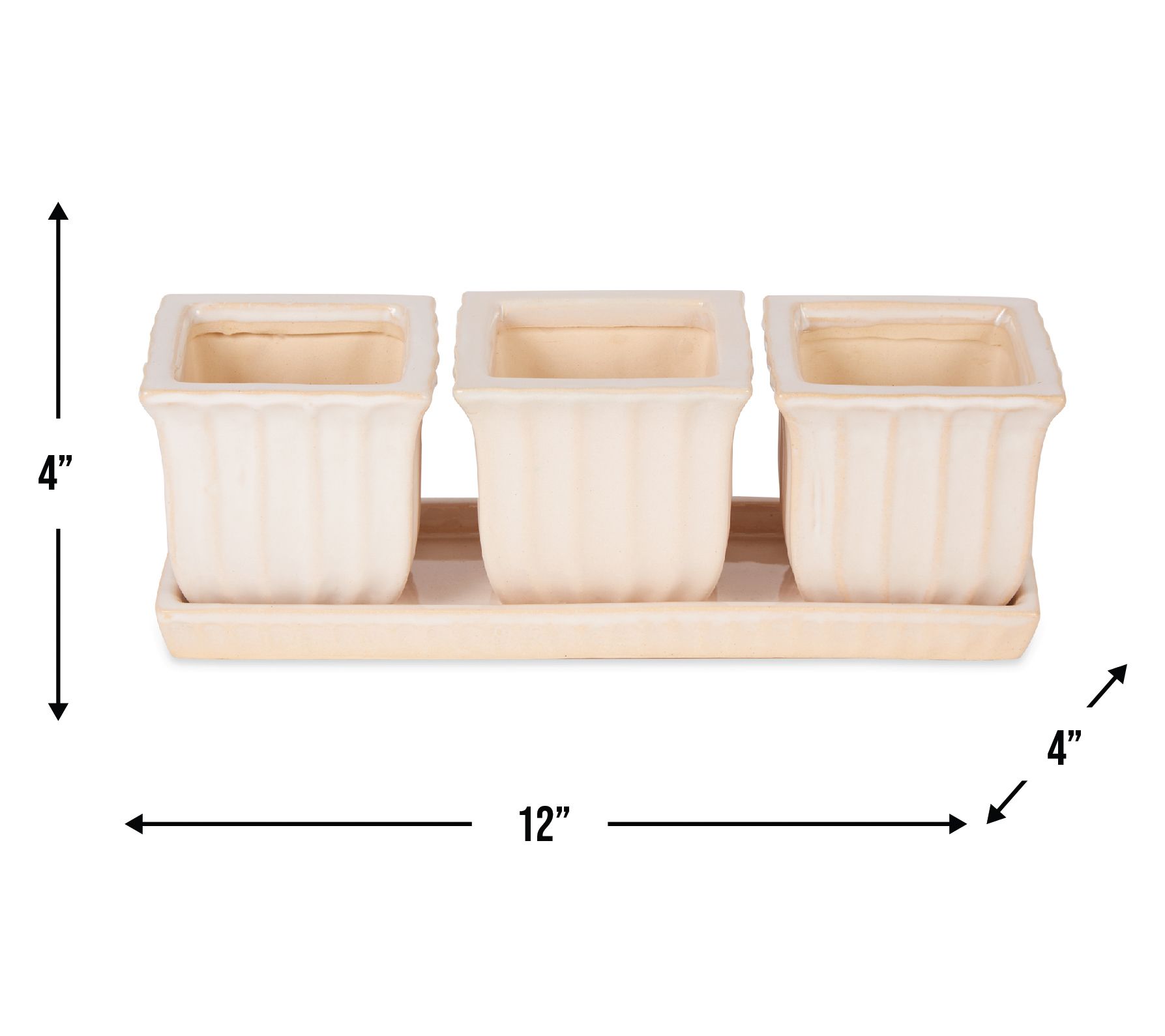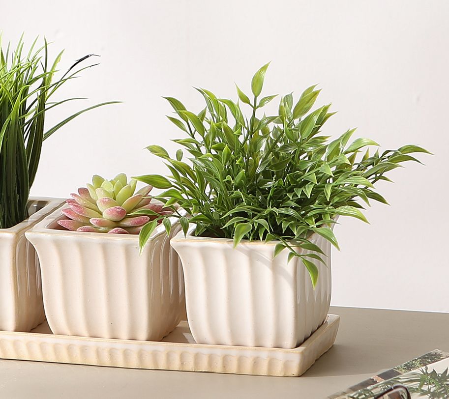 • Includes three square pots and one saucer