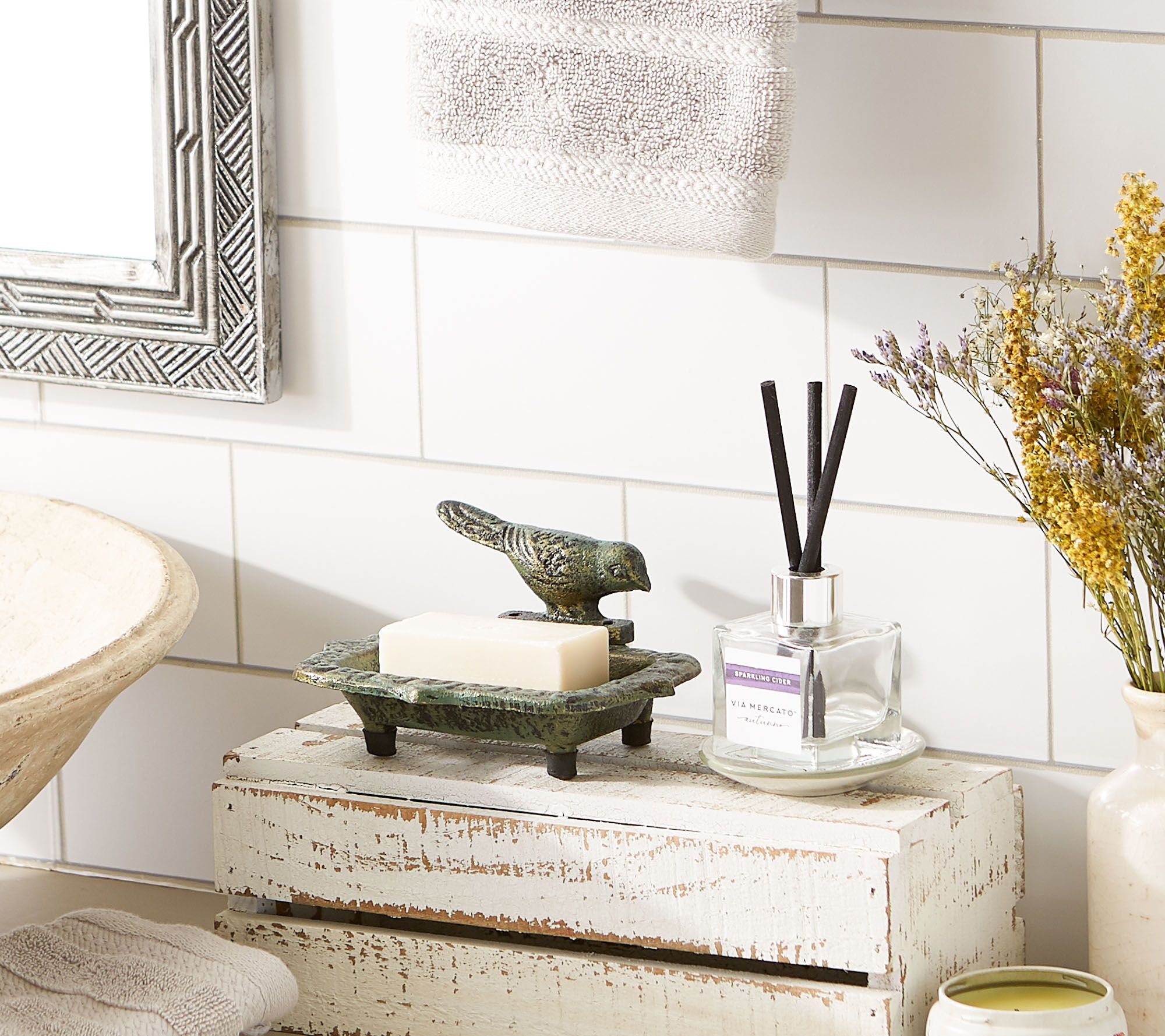 This sweet song bird soap dish is designed with a distressed moss green and gold finish that adds charm to any sink area, with drain holes to prevent soggy soap. From Zingz & Thingz.