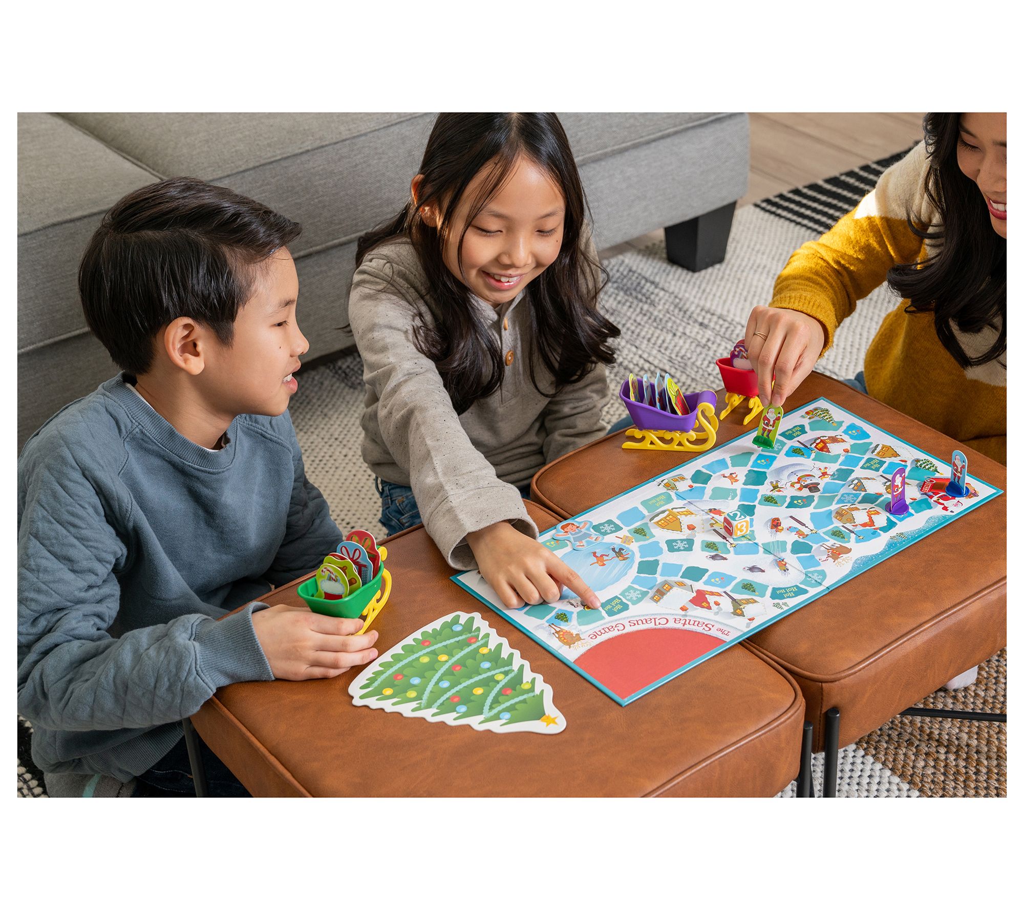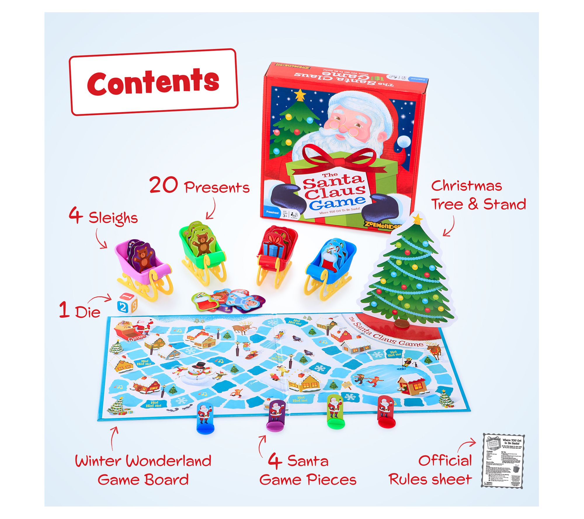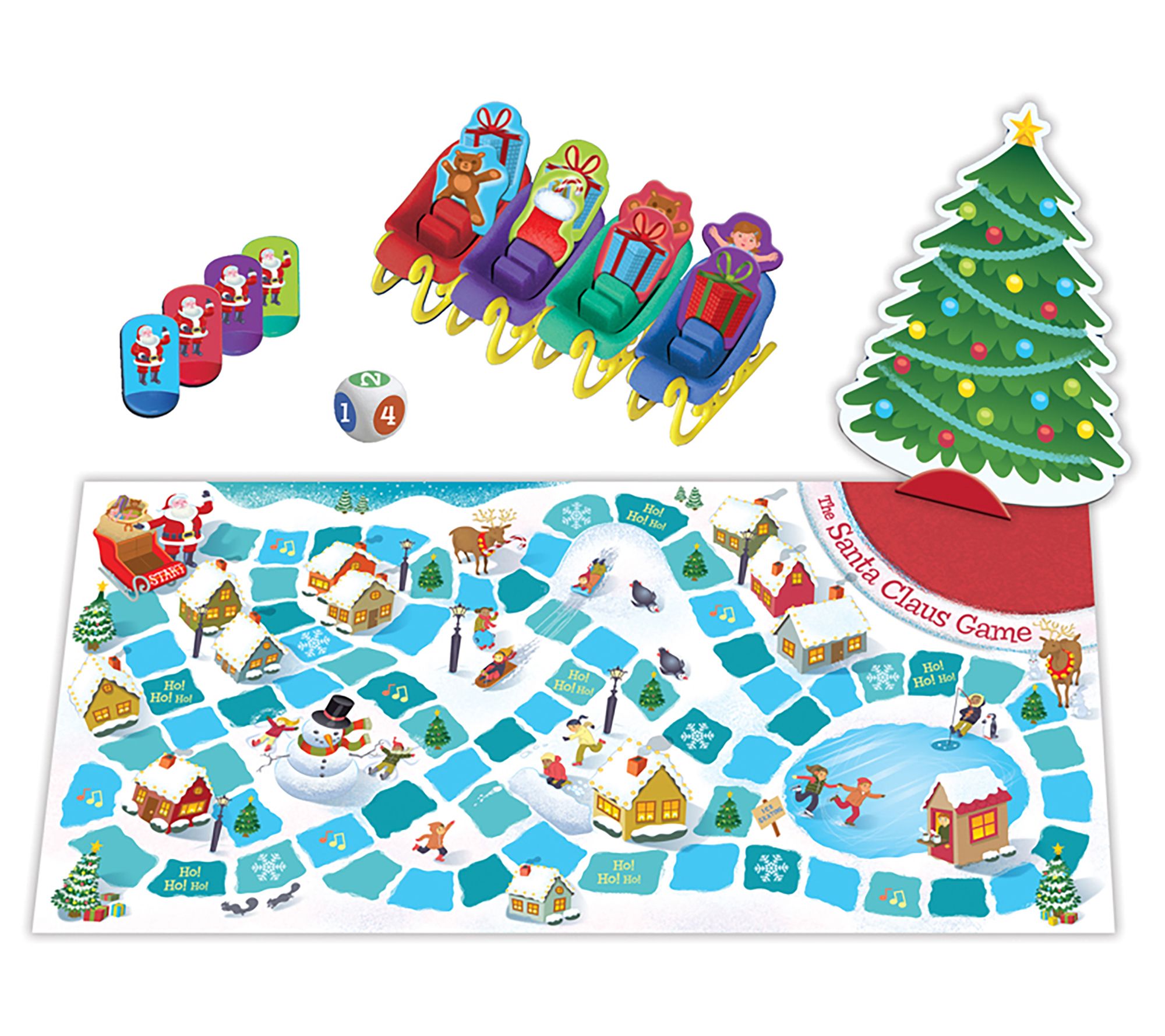 • Includes game board, 20 presents, four sleighs, four Santas, dice, Christmas tress, tree stand, and rule sheet