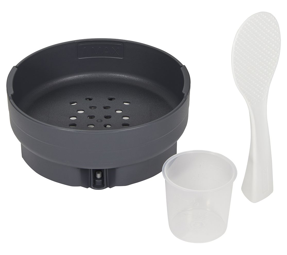 Includes 5.5-cup rice cooker, steaming basket, self-standing spatula, measuring cup, power cord, instruction manual, and quick start guide