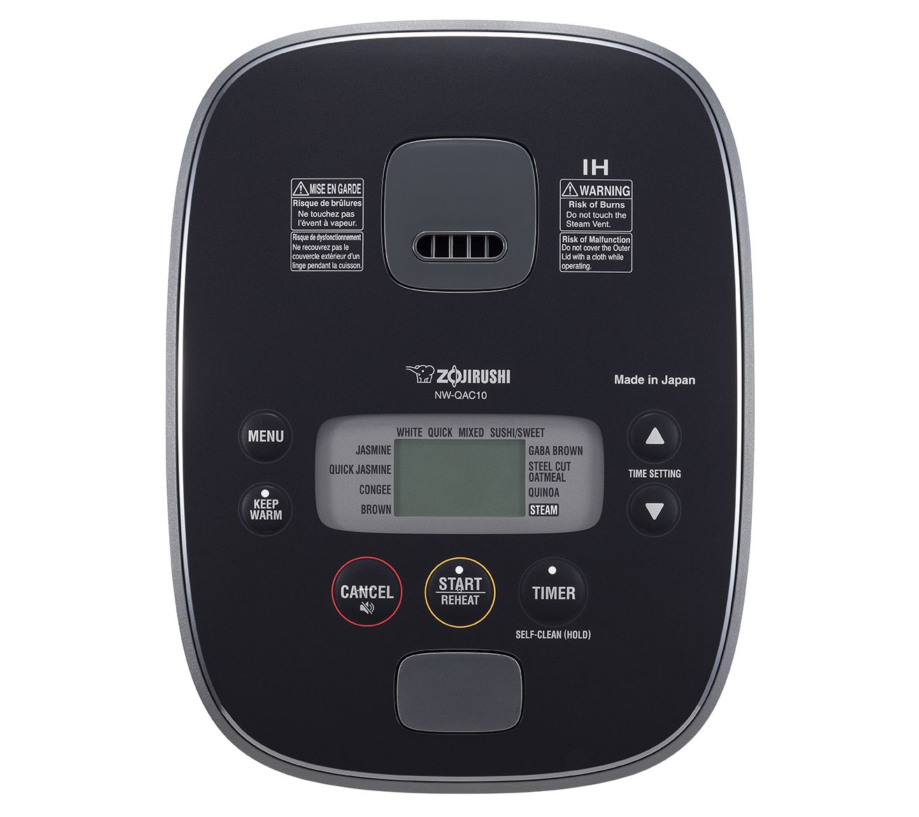 Menu settings include white, quick white, mixed, sushi/sweet, Jasmine, quick Jasmine, congee, brown, GABA brown, steel cut oatmeal, quinoa, and steam